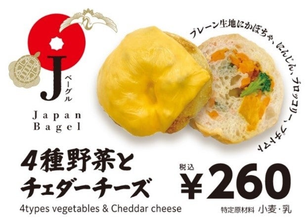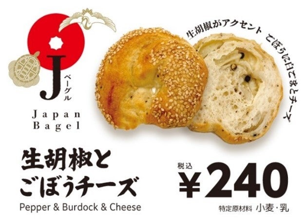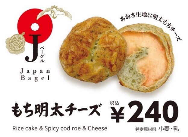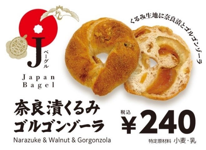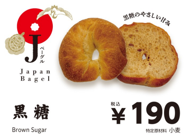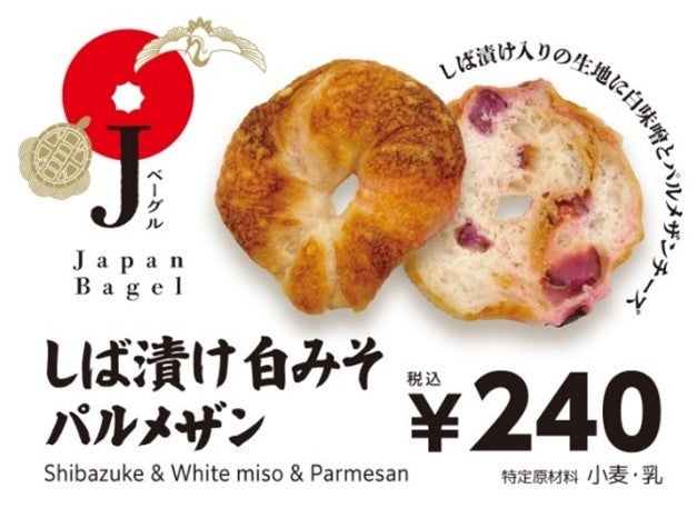 10月1日(日)から期間限定で発売をする『Jベーグル』は日本ならではの食材を使用している商品でJベーグルの『J』はJAPANの頭文字を表しています。生地に米粉を使用し、しっとりもちもちとした食感が特徴のベーグルの中に、漬物や味噌、餅など日本ならではの食材を混ぜ合わせ、焼き上げました。