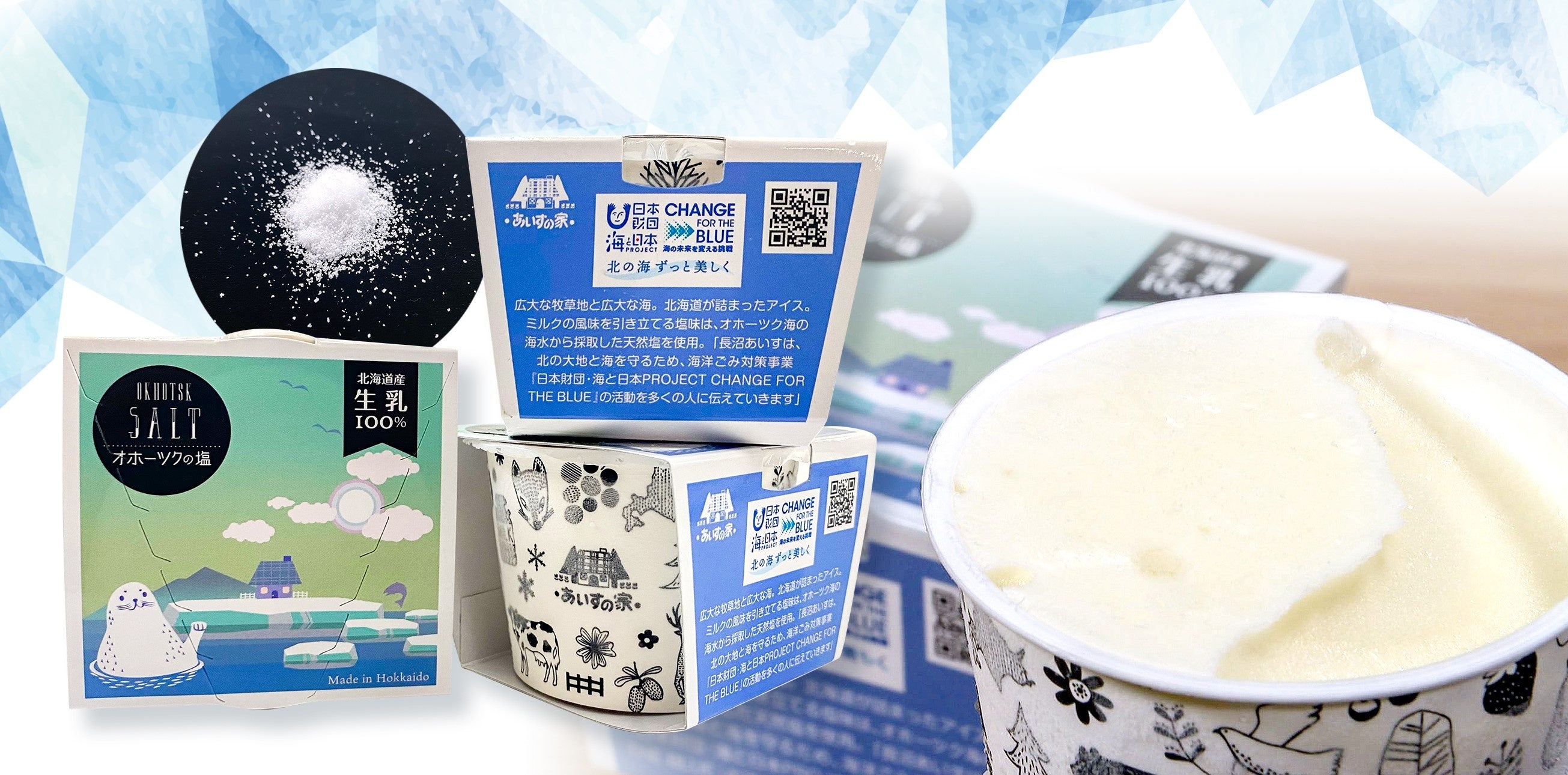 本プロジェクトに快く賛同していただいた「(株)長沼あいす」の山口社長は、かねてから環境保護に興味があり、大学セミナーに参加して知識を増やし、絶滅危惧種を見に海外へも駆けつけるほど。店内では、極力プラスチック製品を使わないようにと、紙の容器や木製スプーンで提供しています。社長の想いを、北海道の広大な海と大地をイメージさせるこの商品に乗せて、「北の海ずっと美しく」CHANGE FOR THE BLUEのロゴとメッセージ入りの限定パッケージを販売いたします。