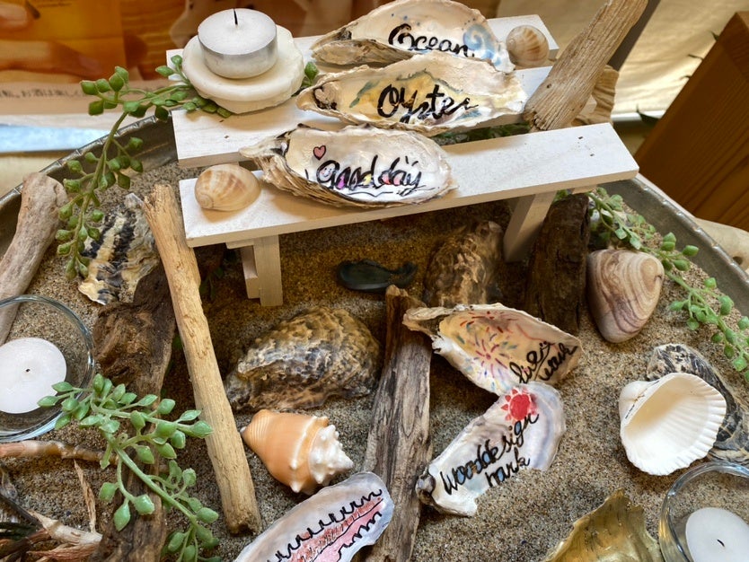 待ってる間のワクワク倍増。牡蠣の殻にお好きな文字や言葉を入れて思いで作り。もちろんお持ち帰りいただけます。