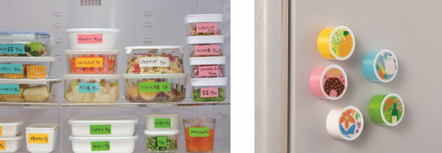 「ディアキチ(TM)ワザアリ(TM)テープ」は、食品袋の封止めはもちろん、保存容器やフリーザーバッグの日付・内容物のラベルなどに使える便利なテープです。マグネットホルダー付きで、冷蔵庫に貼り付けて保管することができます。