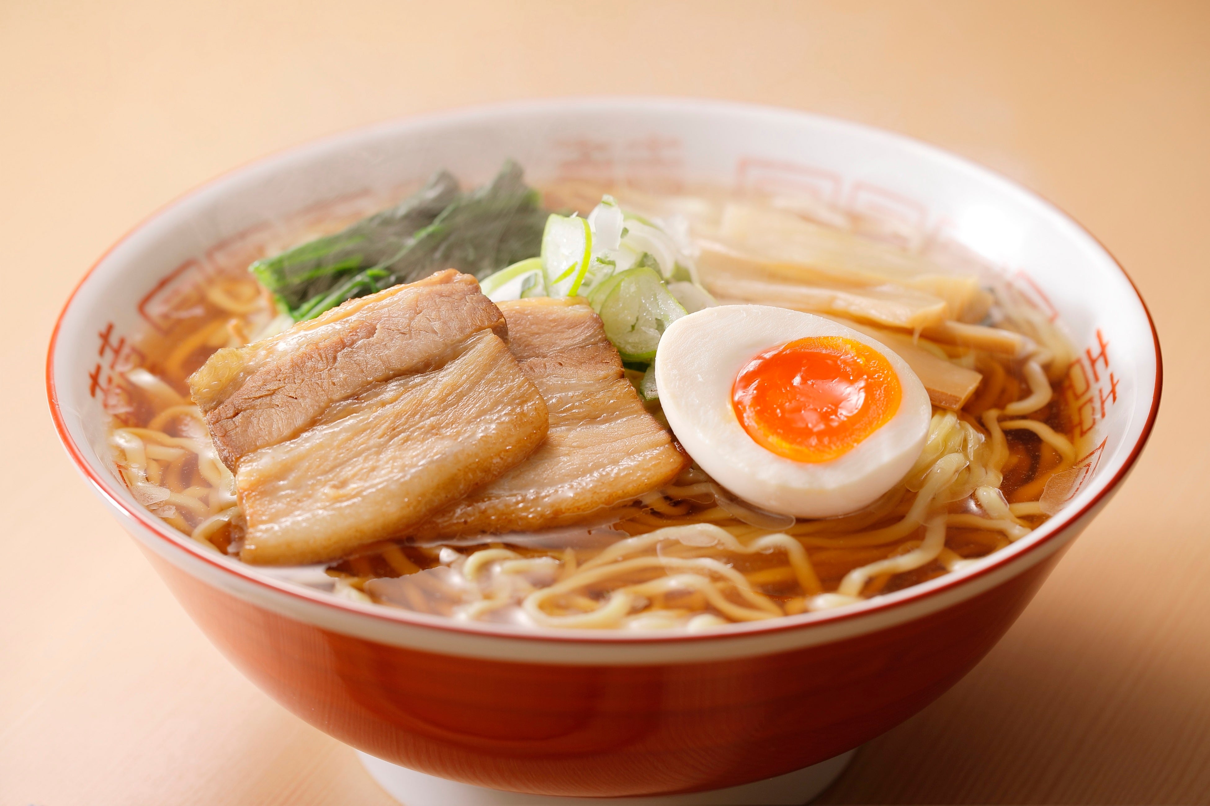 河京の喜多方ラーメンは厳選された小麦粉を使用した平打ち縮れ麺に、創業当時から変わらない鶏ガラ、とんこつベース、野菜の風味が効いた香味油が香る淡麗な醤油スープ付き。一度食べたらくせになる定番の味と好評いただいております。