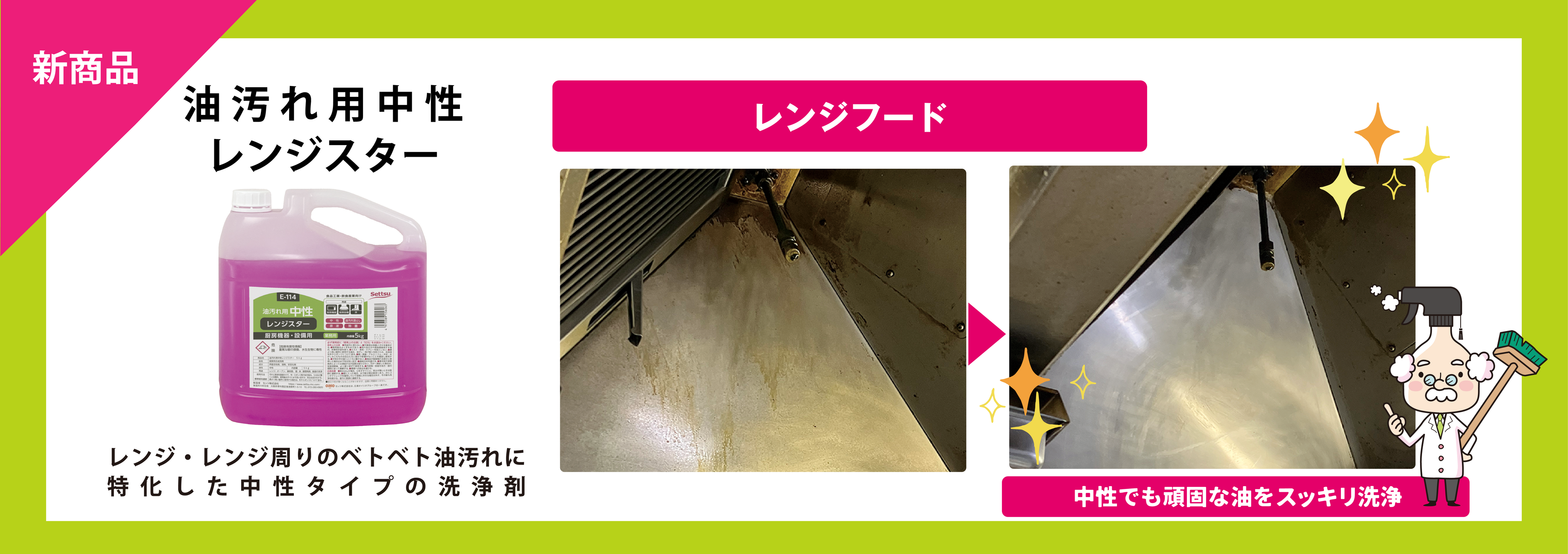 そんな課題を解決する商品として、「油汚れ用中性レンジスター」を開発しました。この商品は厨房内のベトベトした油汚れが簡単に洗浄でき、働く人に快適な作業環境を提供します。中性タイプで、使う人にやさしく、アルカリ性タイプに比べて掃除する箇所を傷めにくい洗浄剤です。