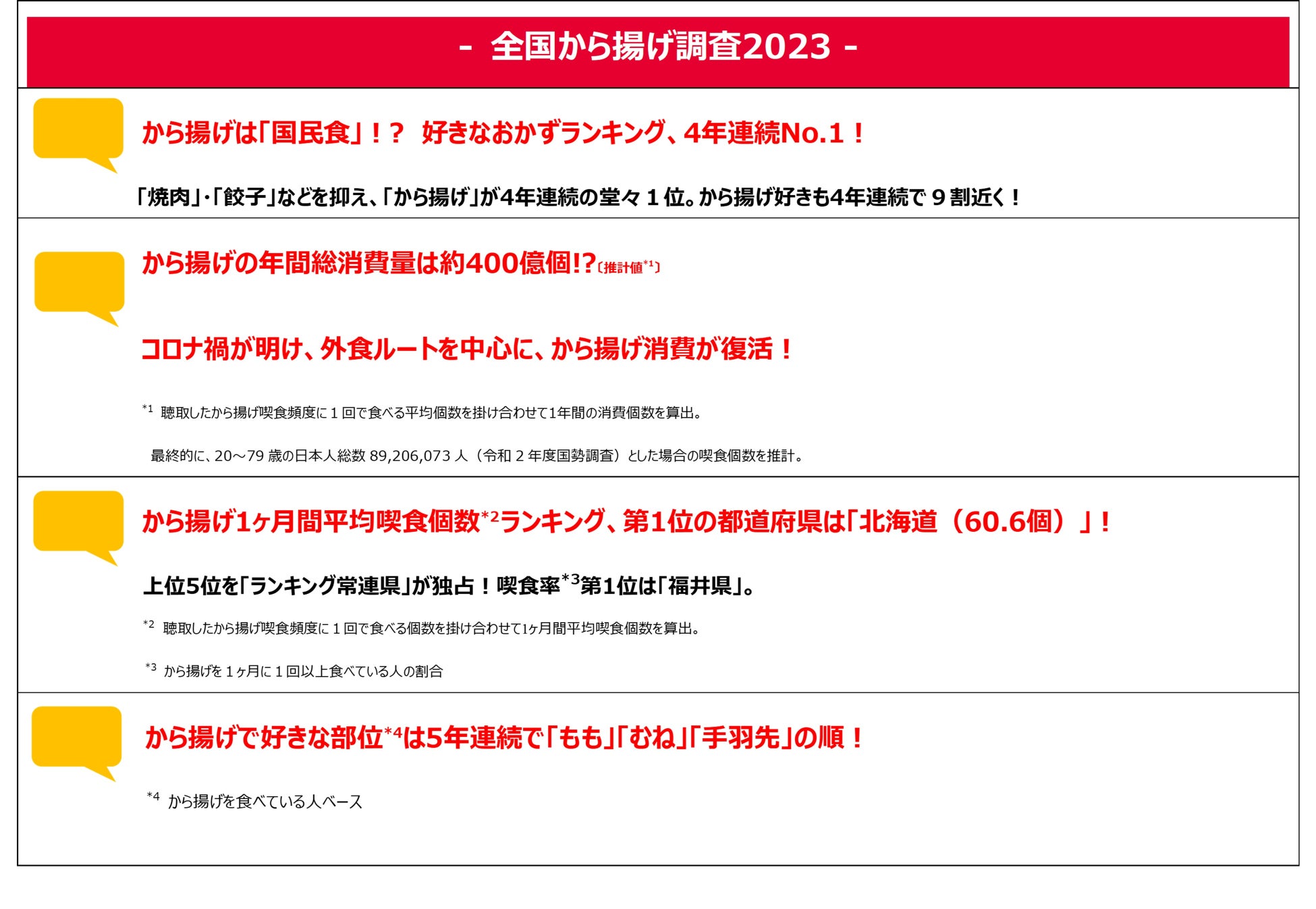 全国のから揚げ消費個数を推計で算出したところ、2023年の年間消費量は約400億個以上となる見込みで、昨年比は約109%、コロナ禍前の2019年調査との比較では約160%となることが分かった。から揚げの年間消費量は、コロナ禍の「巣ごもり需要」により急伸したが、コロナ禍が明け物価上昇が見られる中、高止まりは継続している。