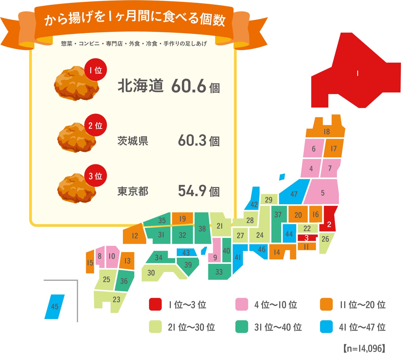 から揚げ1ヶ月間平均喫食個数*2ランキング、第1位の都道府県は「北海道(60.6個)」!
