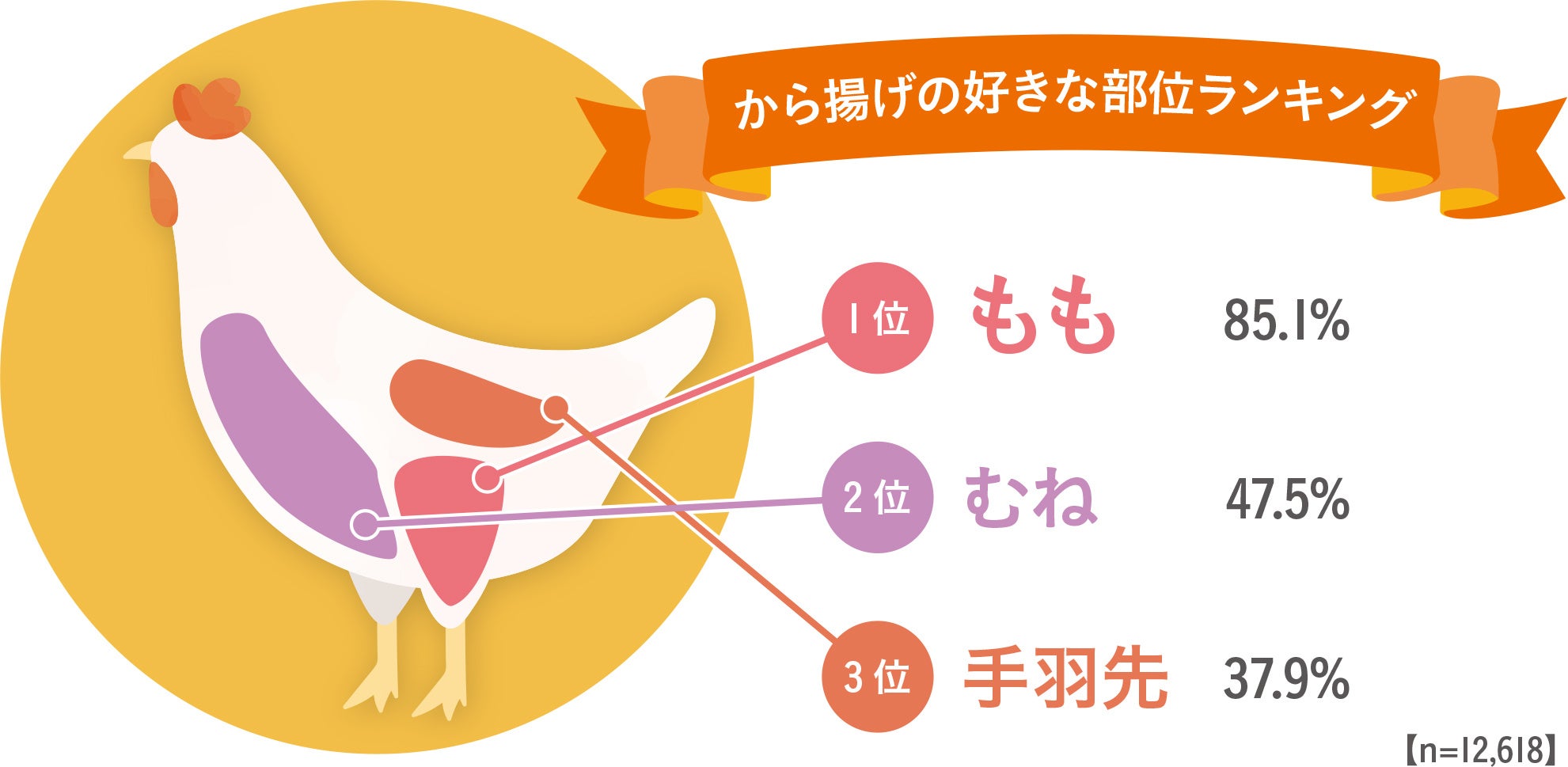 から揚げの好きな部位をみると、4年連続で「もも(85.1%)」「むね(47.5%)」「手羽先(37.9%)」の順。