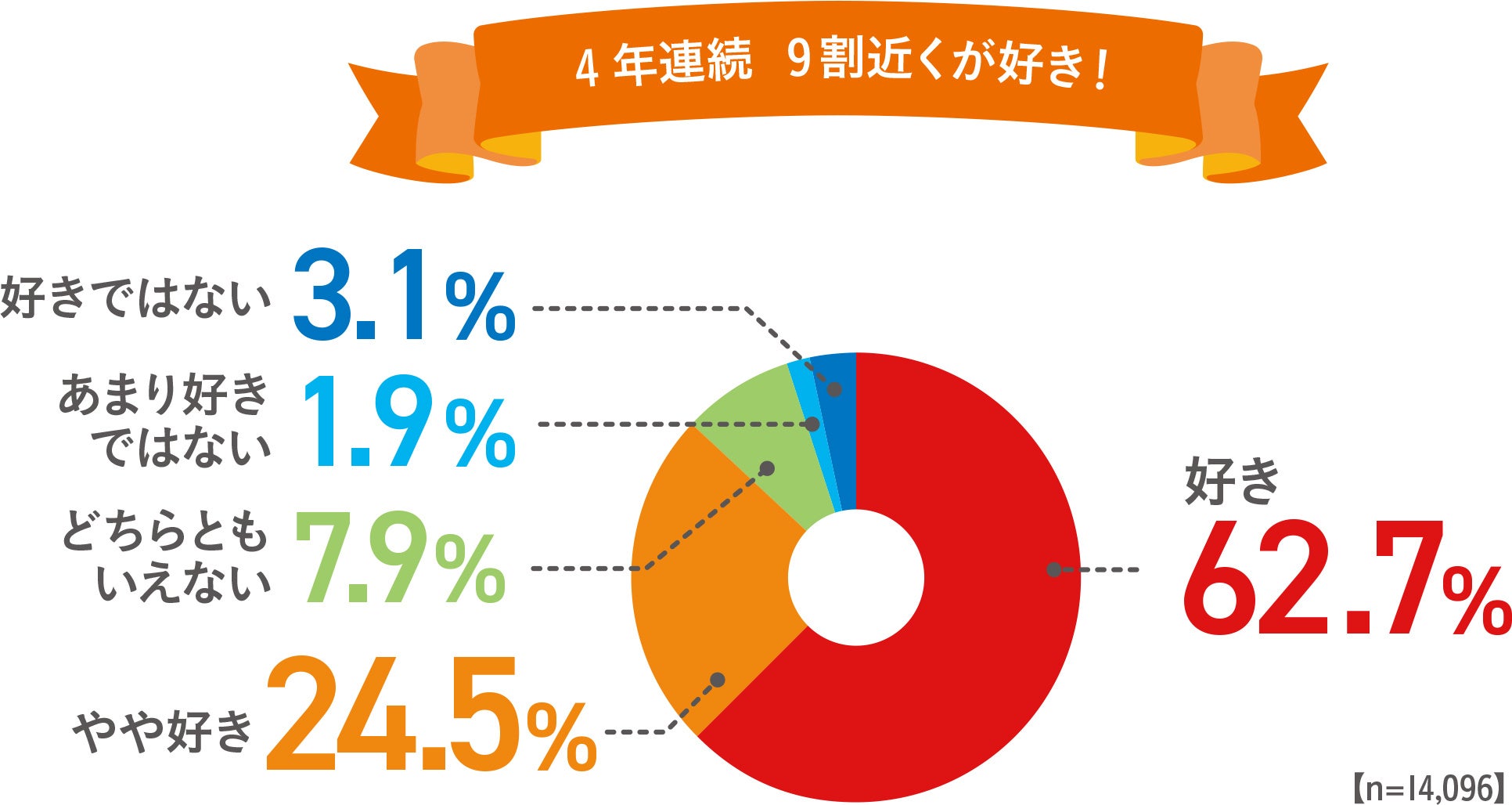 から揚げの好意レベルを聞いたところ、4年連続で9割近くが好きと回答した(「好き(62.7%)」、「やや好き(24.5%)」)。