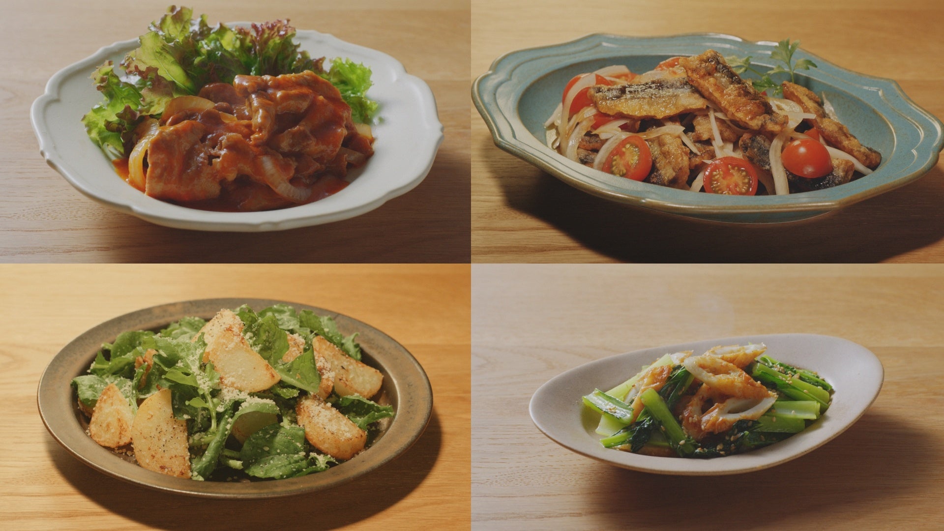 こうした悩みを解消するために開発されたのが4品のレシピと食材がセットの「つくりおき肉魚菜菜セット」です。本サービスは、肉と魚のおかずが各1品、野菜のおかずが2品の合計4品のメニューのレシピと材料が自宅に届く商品セットで、毎日の買い物や献立作りの手間と時間の削減に役立ちます。