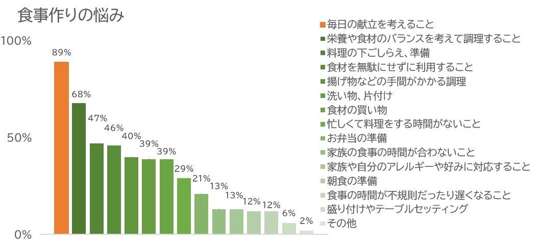 パルシステムが2023年4月に利用者の男女1,176人を対象に実施したアンケートでは、食事の悩みについて、89%が「毎日の献立を考えること」と回答しました。栄養バランスの良いレシピを考えることや、必要な素材を買いそろえることが、多くの人にとって負担になっていることが分かりました。