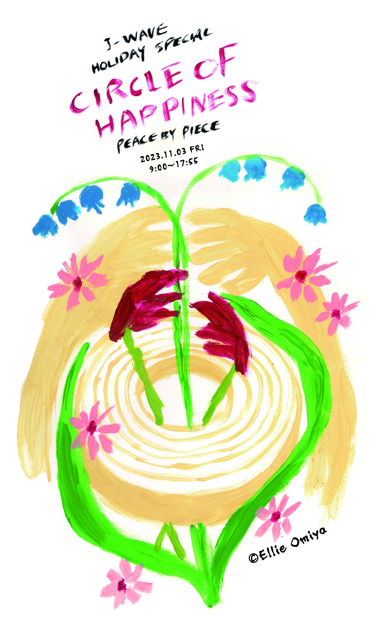 今回のユーハイムのラジオ特番のシンボルアートは、アーティストの大宮エリー氏の描き下ろし。番組タイトルである「CIRCLE OF HAPPINESS -PEACE BY PIECE-」や、テーマとしている「愛・感謝・お祝い」のあたたかな気持ち、そしてユーハイムのお菓子などからイメージを広げ、制作いただきました。