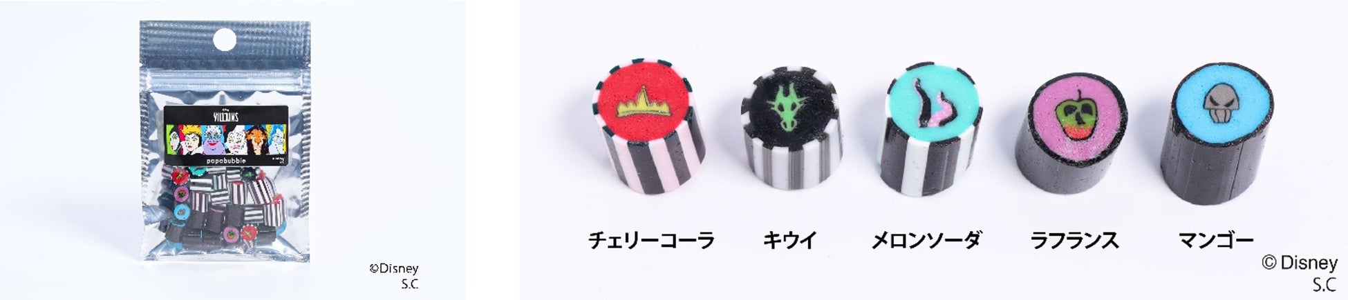 ブラックを基調としたキャンディーに、ビビットな色合いのヴィランズアイコン。ディズニー作品や世界の悪役(villain)キャラクターや敵役キャラクターを指す“ディズニーヴィランズ”をイメージし、小さなキャンディの中にその世界観を詰め込みました。クールで魅力的なウィックド・クイーンモチーフの毒リンゴ柄や、アースラをイメージした吸盤柄などを、パパブブレの職人が忠実に再現。フレーバーも、チェリーコーラやメロンソーダなど、レアなフレーバーをチョイスしました。パパブブレならではの、遊び心あふれるプレミアムダークキャンディーです。