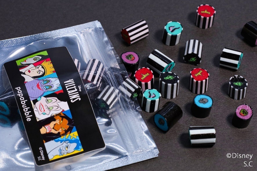 ブラックを基調としたキャンディーに、ビビットな色合いのヴィランズアイコン。ディズニー作品や世界の悪役(villain)キャラクターや敵役キャラクターを指す“ディズニーヴィランズ”をイメージし、小さなキャンディの中にその世界観を詰め込みました。クールで魅力的なウィックド・クイーンモチーフの毒リンゴ柄や、アースラをイメージした吸盤柄などを、パパブブレの職人が忠実に再現。フレーバーも、チェリーコーラやメロンソーダなど、レアなフレーバーをチョイスしました。パパブブレならではの、遊び心あふれるプレミアムダークキャンディーです。