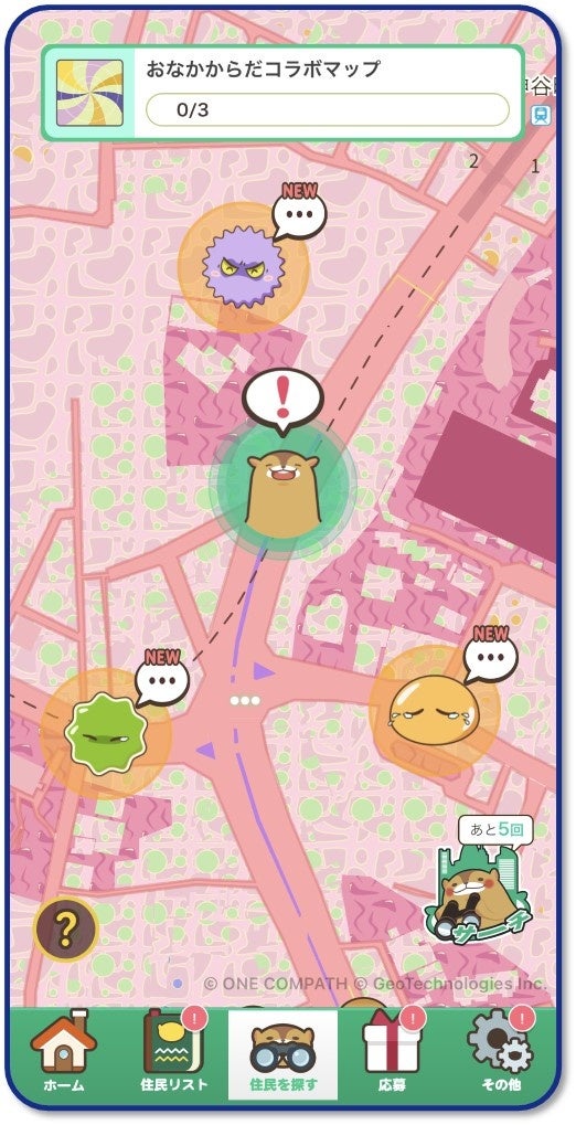 本キャンペーンオリジナルのマップに切り替えると、全国約40万か所にオリジナルキャラクターとして“腸内細菌”がaruku&内の住民として登場します。住民キャラクターに話しかけ、依頼された歩数(例:3時間以内に1000歩あるく)を制限時間内に達成することでプレゼント応募に必要な応募カード「おなかからだカード」が手に入ります。また、依頼達成でキャラクターのコレクションが埋まっていきます。