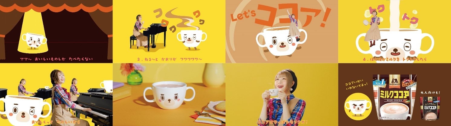 ミルクココアの作り方を楽しく学びつつ、作る手順を紹介し、ハラミちゃんが弾くピアノと近くで踊ったり飛び跳ねたりするコマグちゃんの明るく楽しい曲で作り方を訴求いたします。