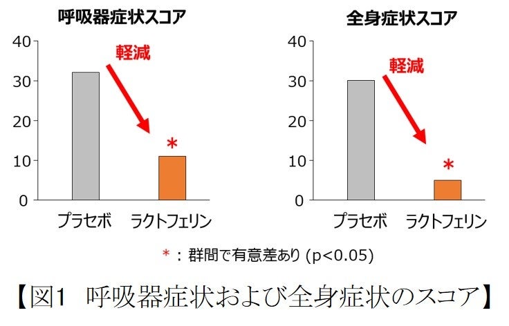 摂取期間中の呼吸器症状および全身症状のスコアは、ラクトフェリン群でプラセボ群と比較して有意に低い値を示しました(図1)。