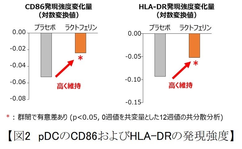 摂取後のpDCの活性指標であるCD86およびHLA-DRの発現強度は、ラクトフェリン群でプラセボ群と比較して有意に高い値を示しました(図2)。