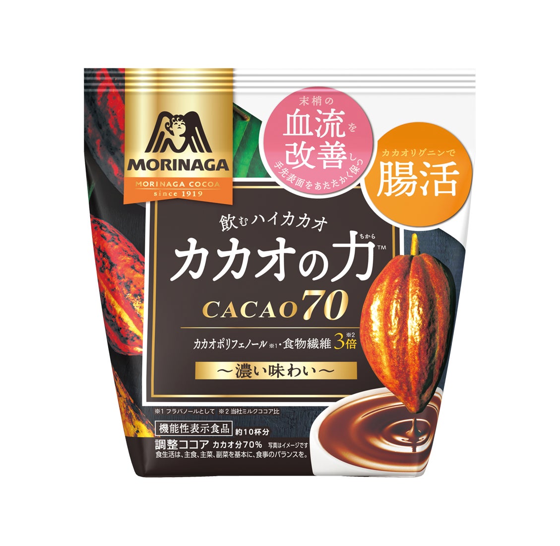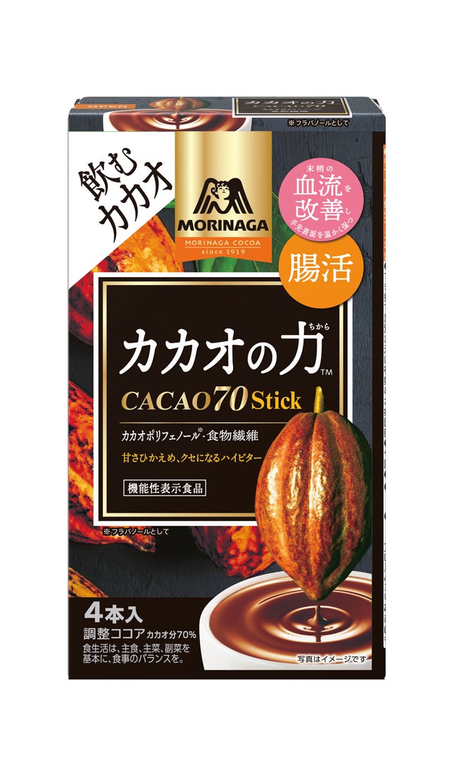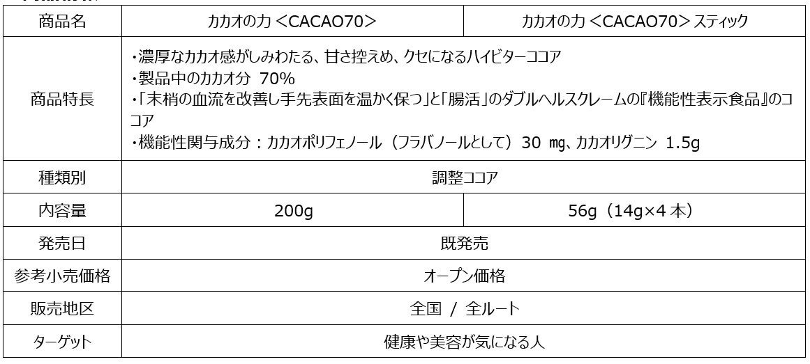 「カカオの力<CACAO70>」は、「血流改善(末梢の血流を改善し手先表面を温かく保つ)」と「腸活(カカオリグニンが、便通が気になる方のおなかの調子を整える)」のダブルヘルスクレームの『機能性表示食品』として発売しています。
