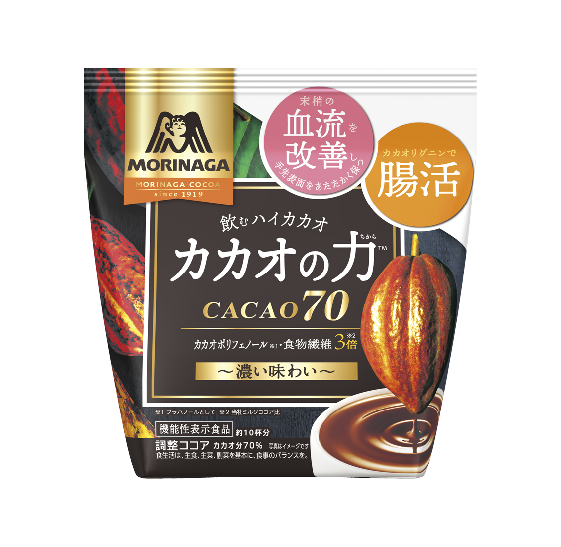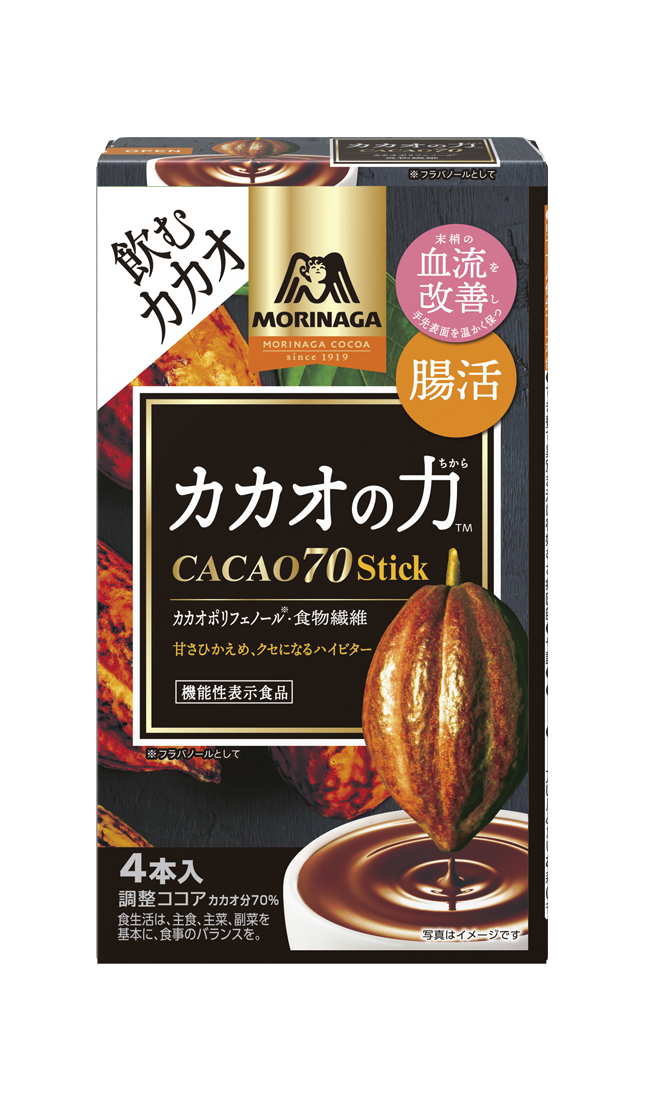 「カカオの力<CACAO70>」は、「血流改善(末梢の血流を改善し手先表面を温かく保つ)」と「腸活(カカオリグニンが、便通が気になる方のおなかの調子を整える)」のダブルヘルスクレームの『機能性表示食品』として発売しています。
