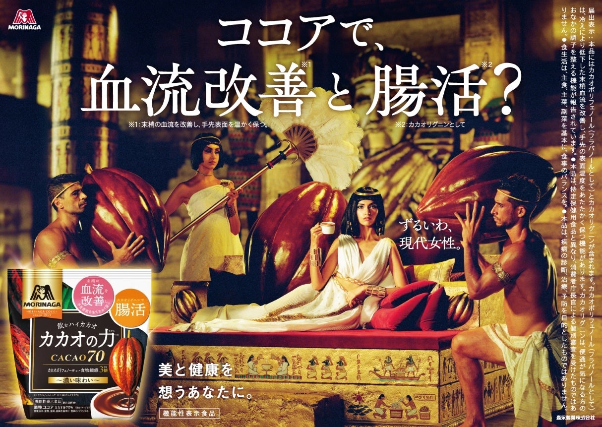 WEB動画に登場するのは美の憧れとして多くの女性から語り継がれているクレオパトラ。いにしえからカカオは存在したにも関わらず、濃厚なカカオ感と控えめな甘さがおいしい機能性表示食品「カカオの力<CACAO70>」を飲むことができる現代女性を、羨ましがるクレオパトラが描かれています。