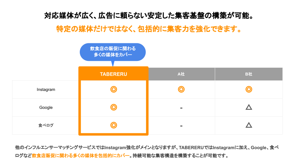 他のインフルエンサーマッチングサービスではInstagram強化がメインとなりますが、TABERERUではInstagramに加え、Google、食べログなど飲食店販促に関わる多くの媒体を包括的にカバー。持続可能な集客構造を構築することが可能です。