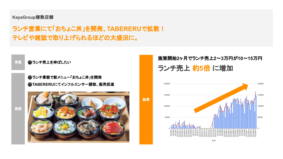 施策開始2ヶ月でランチ売上2〜3万円が10〜15万円、 約5倍に増加し、自社メディアからの集客・売上アップを実現させました。