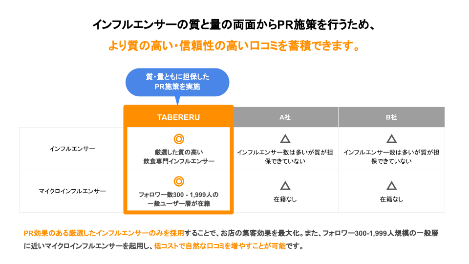 TABERERU(タベレル)では、PR効果のある厳選したインフルエンサーのみを採用することで、お店の集客効果を最大化。また、フォロワー300-1,999人規模の一般層に近いマイクロインフルエンサーを起用し、低コストで自然な口コミを増やすことが可能です。