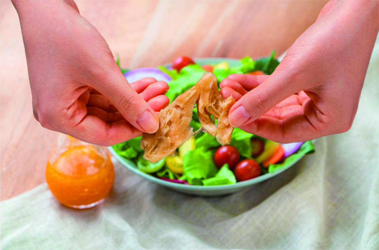 LIKE CHICKEN!?(以下、ライクチキン)は、これまでにない鶏肉のような弾力のある歯ごたえとさけるような繊維感が特徴の、新しい大豆ミートです。