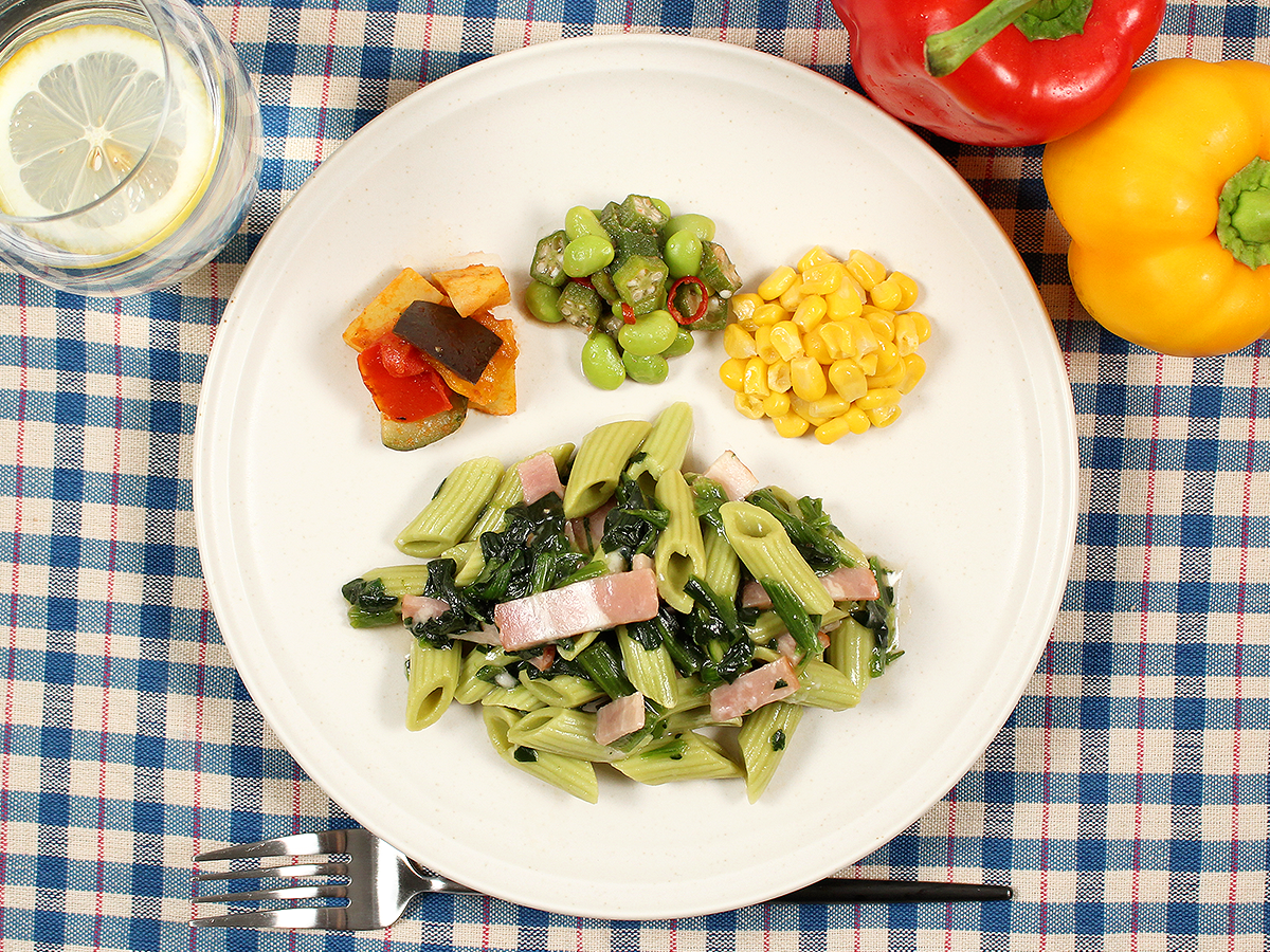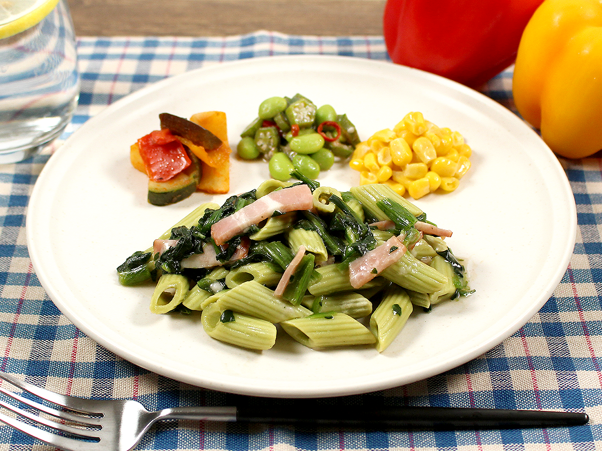 ほうれん草を練りこんだペンネとベーコンを組み合わせ、あっさりとした風味豊かなパスタをお楽しみいただける一品です。野菜をメインにしたプレートで、チーズのコク、黒コショウのアクセント、そしてほのかに香るバターの香りが味の決め手となっております。 ソースとパスタをよく混ぜてお召し上がりください。