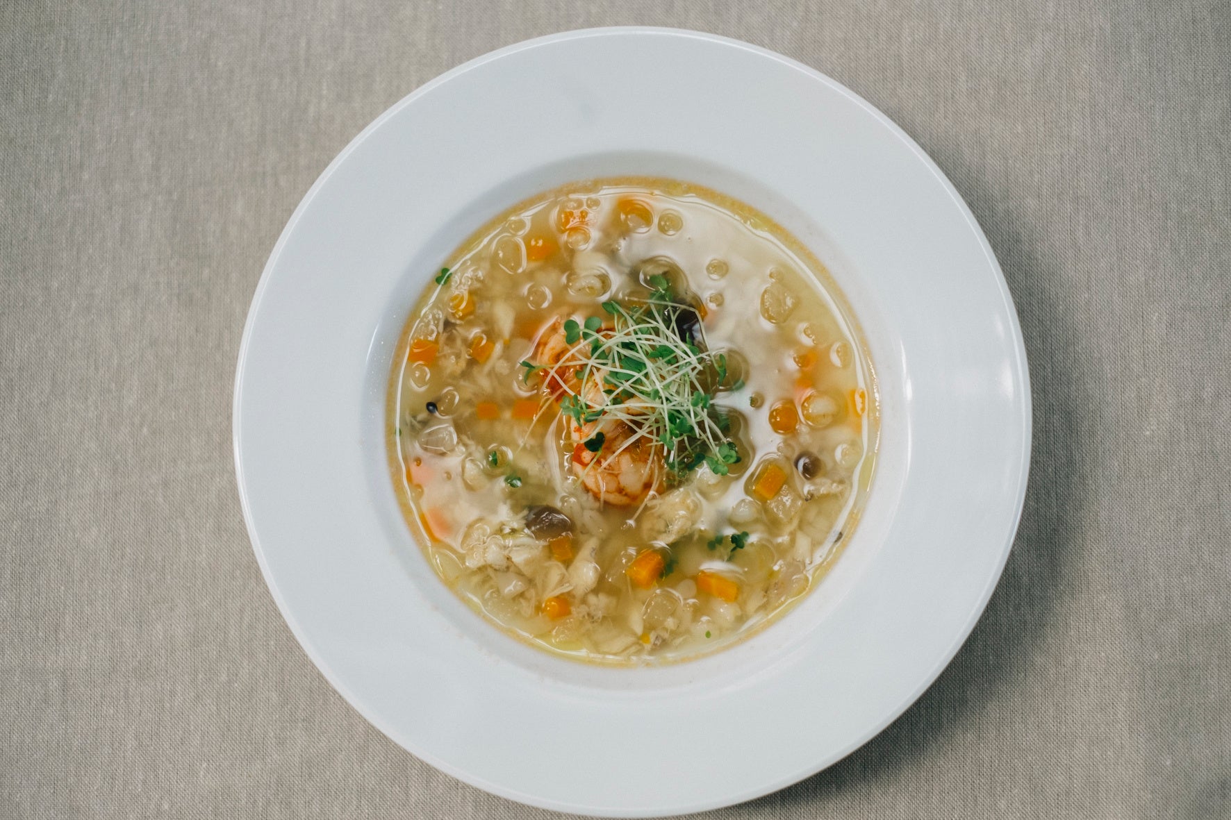「鯛のあら&丸ごとエビ出汁の根菜ともち麦入スープ」※小麦、えび