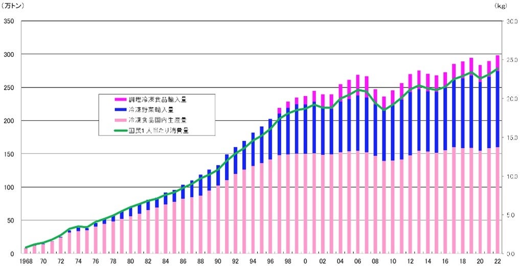 コロナ禍によるライフスタイルの変化や共働き家庭の増加により長期保存が可能なことでの利便性、簡便性にプラスしてタイムパフォーマンスニーズも増えていることで、冷凍食品市場は年々右肩上がりで伸長しております。尚、2022年の日本人1人当りの冷凍食品消費量は23.9kgとなり、10年前と比較すると2.2kg増加しています。