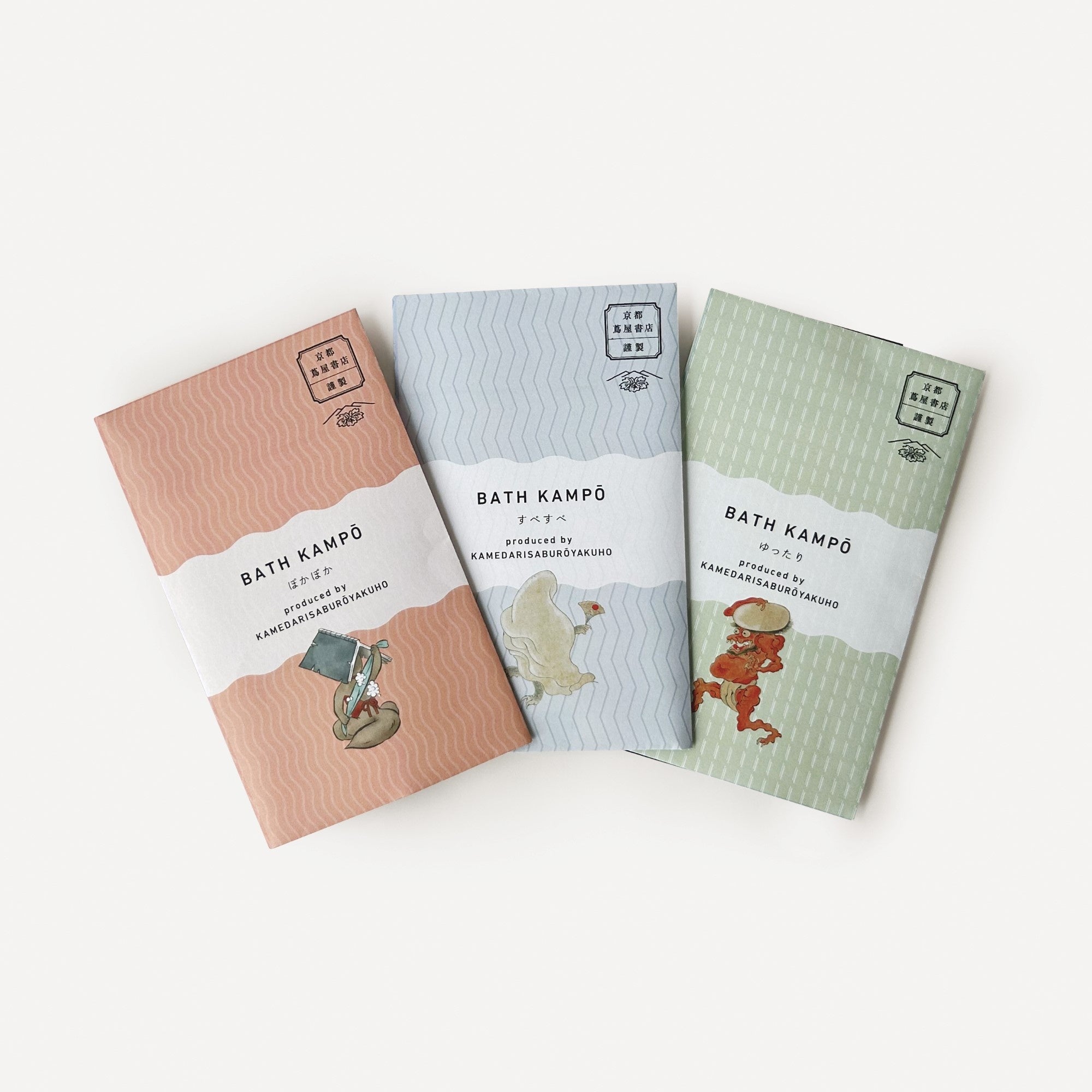 ケミカルなものは一切入っていない天然の生薬のみをブレンドした入浴剤。素朴だけれど贅沢な時間を過ごしてほしという想いで作られています。冷えた体を芯から温めてほぐしてくれる〈ぽかぽか〉、季節の変わり目などに揺らぎやすい肌におすすめの〈すべすべ〉、高級香木と国産生薬を贅沢に配合し香り豊かな〈ゆったり〉の3種。