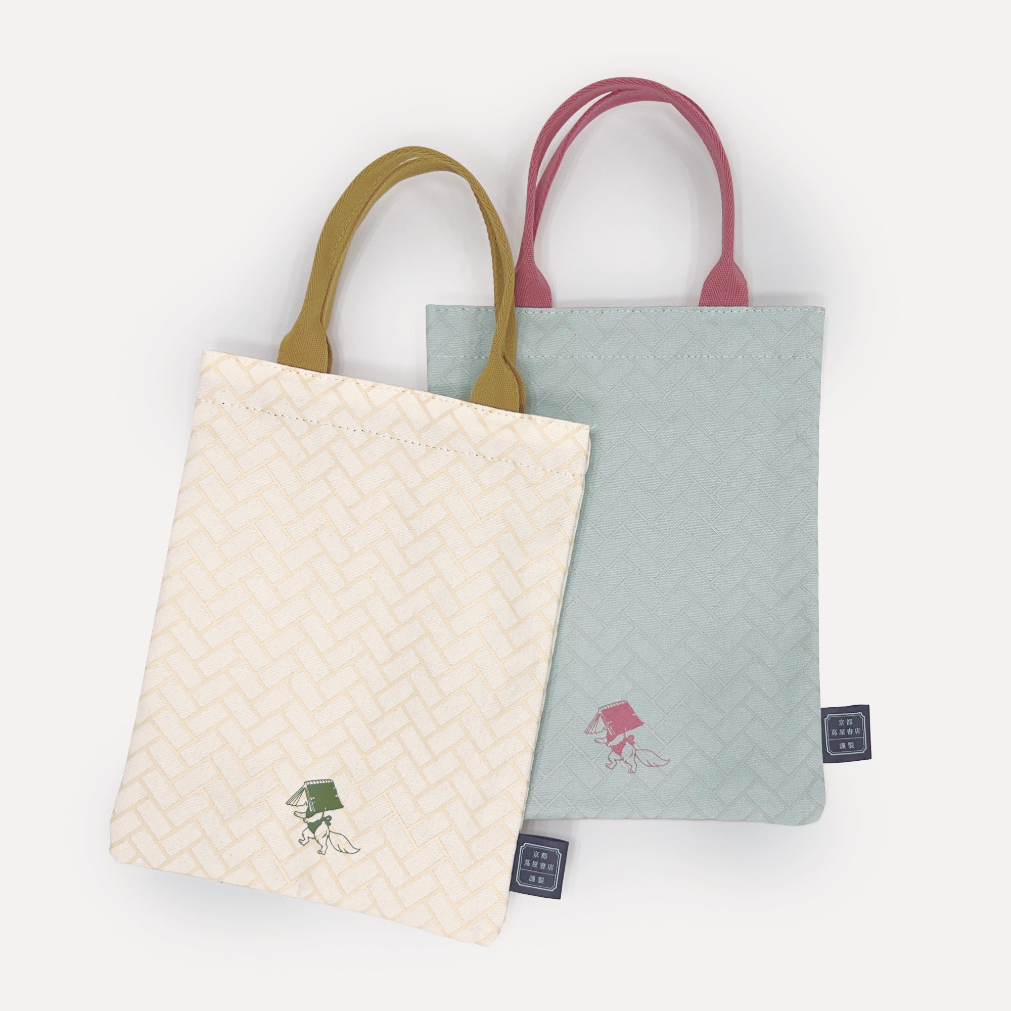 「京都 蔦屋書店に棲みつく付喪神」がデザインされたオリジナルトートバッグ。桧垣(ひがき)という、檜(ひのき)の薄板(へぎ)を網代に組んだ垣根を文様化した古典模様をあしらっています。着物の帯などに多く使われてきた模様を、今の暮らしに合うようスマートフォンと小さなお財布の入るバッグの柄に用いました。