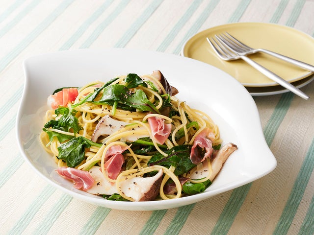 <ベビーリーフとキノコのごちそうパスタ>