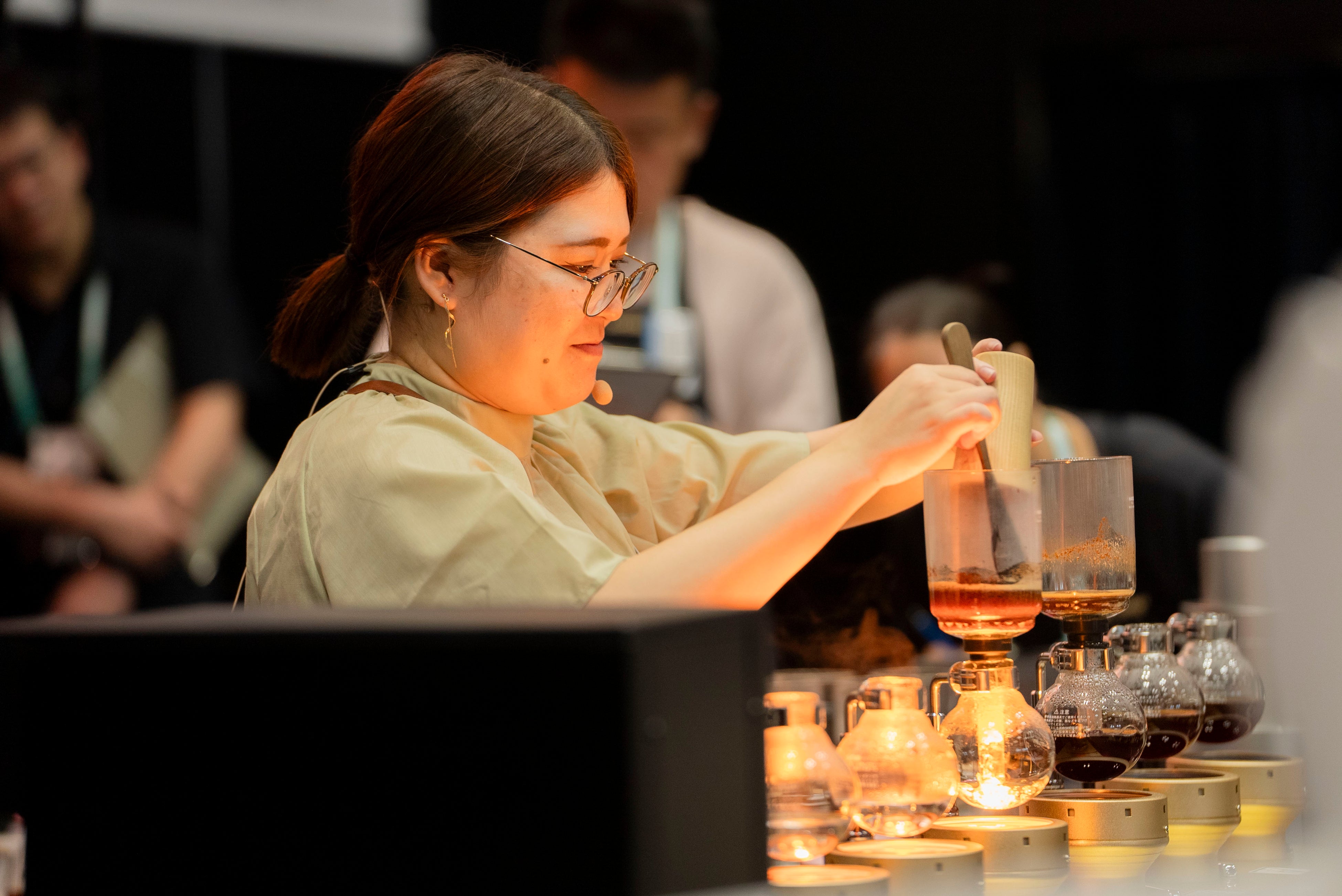 WSC2023は、9月27日(水)~9月30日(土)まで、日本スペシャルティコーヒー協会が主催する、アジア最大のスペシャルティコーヒーイベント「SCAJ ワールド スペシャルティコーヒー カンファレンス アンド エキシビション 2023」の会場内で開催され、中国やタイなどの5の国と地域から代表選手が出場し、サイフォンの抽出器具を用いて、その抽出技術を競いました。WSC2023では、出場者が事前に選定し、焙煎・ブレンドした豆を使い、15分間で味わいなどについて英語でプレゼンテーションをしながら、サイフォンで抽出したブレンドコーヒーとシグニチャービバレッジ(独自にアレンジしたコーヒーメニュー)を審査員に提供しました。