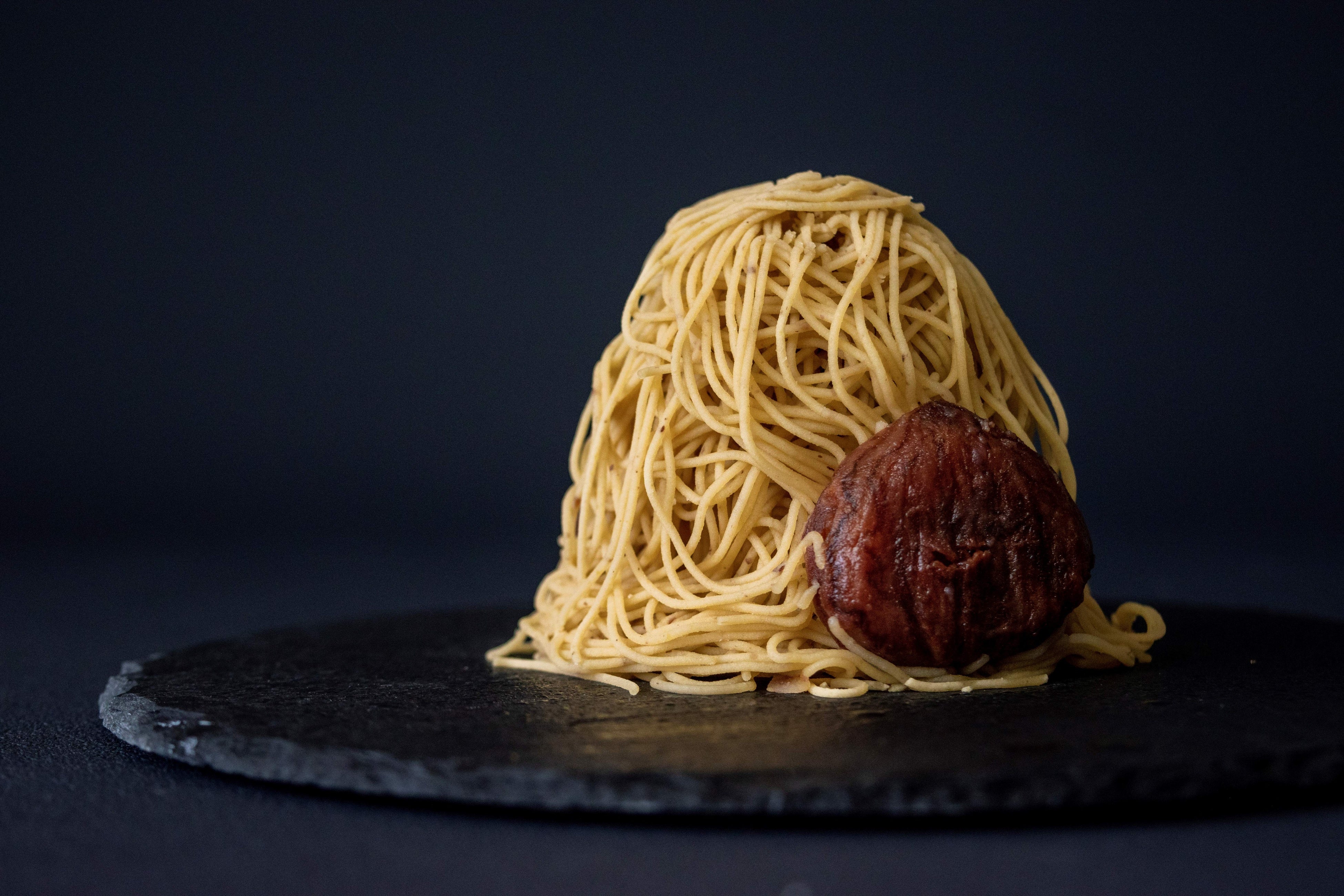 毎年大人気の<ホテルニューオータニ パティスリーSATSUKI(サツキ)>のモンブラン。今回登場するのは、<ピエール・エルメ・パリ>とコラボした、2ブランドの開業25周年を祝う記念すべき一品です。数種類の国産栗をブレンドしたマロンペーストは、濃厚でなめらかな口当たり。その中には熊本県産和栗の甘露煮、バニラ風味の九州大牟田産生クリーム、オレンジピールの酸味を効かせたタルト生地が入っており、奥行きのある味わいを演出しています。