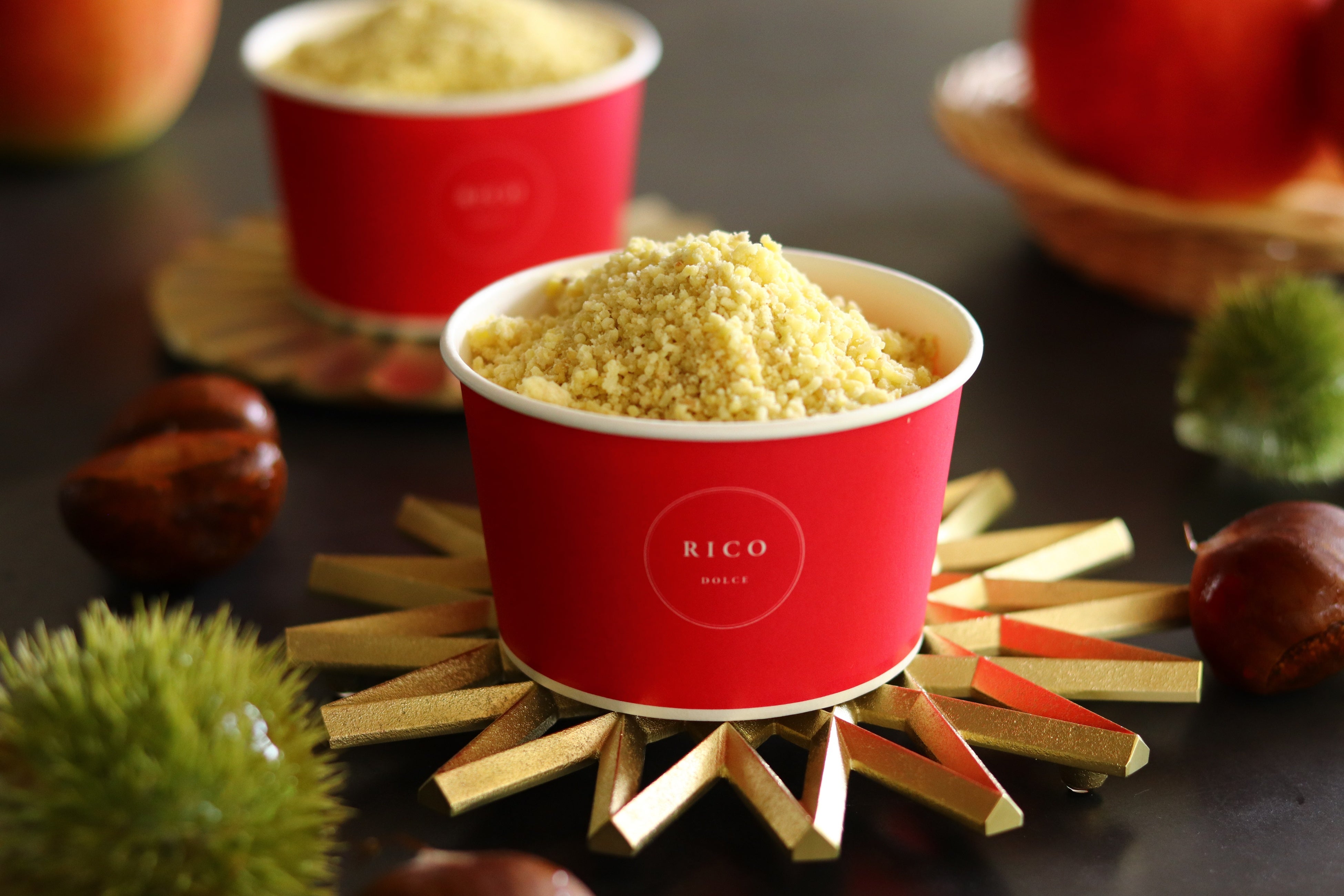 <RICO DOLCE>は、栗加工機メーカーの手掛ける和栗専門店です。栗加工の専門家だからできる新しい栗のお召し上がり方をご提案しています。「こがね 芭紅haku」は旬の果実 栗とりんごを使い、一皿で秋の味覚を存分にお楽しみいただきたい、という想いから作りました。美味しさと香りを閉じ込めた粒状の栗をケーキにたっぷりとかけて仕上げる、今までにないスタイルのモンブランです。