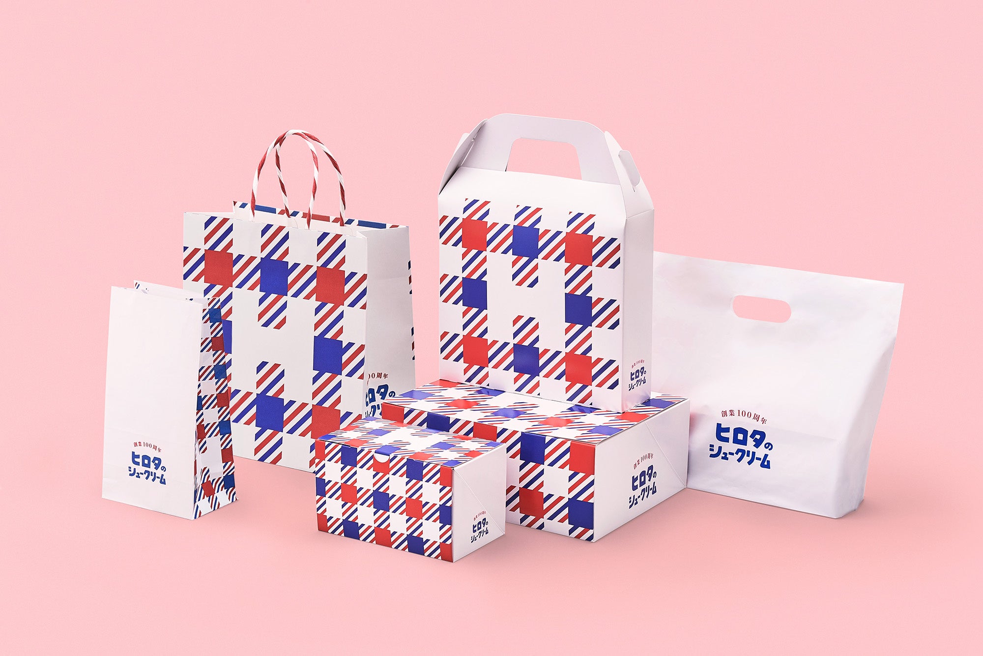 現在のロゴ「HIROTA」から、カタカナの「ヒロタ」に変更、象徴的なブルーは残しながら、創業当時のロゴをイメージしたどこか懐かしさを感じるフォントがコンセプトを表現します。シュークリームを模ったロゴや、創業100周年の記念ロゴも用意しています。