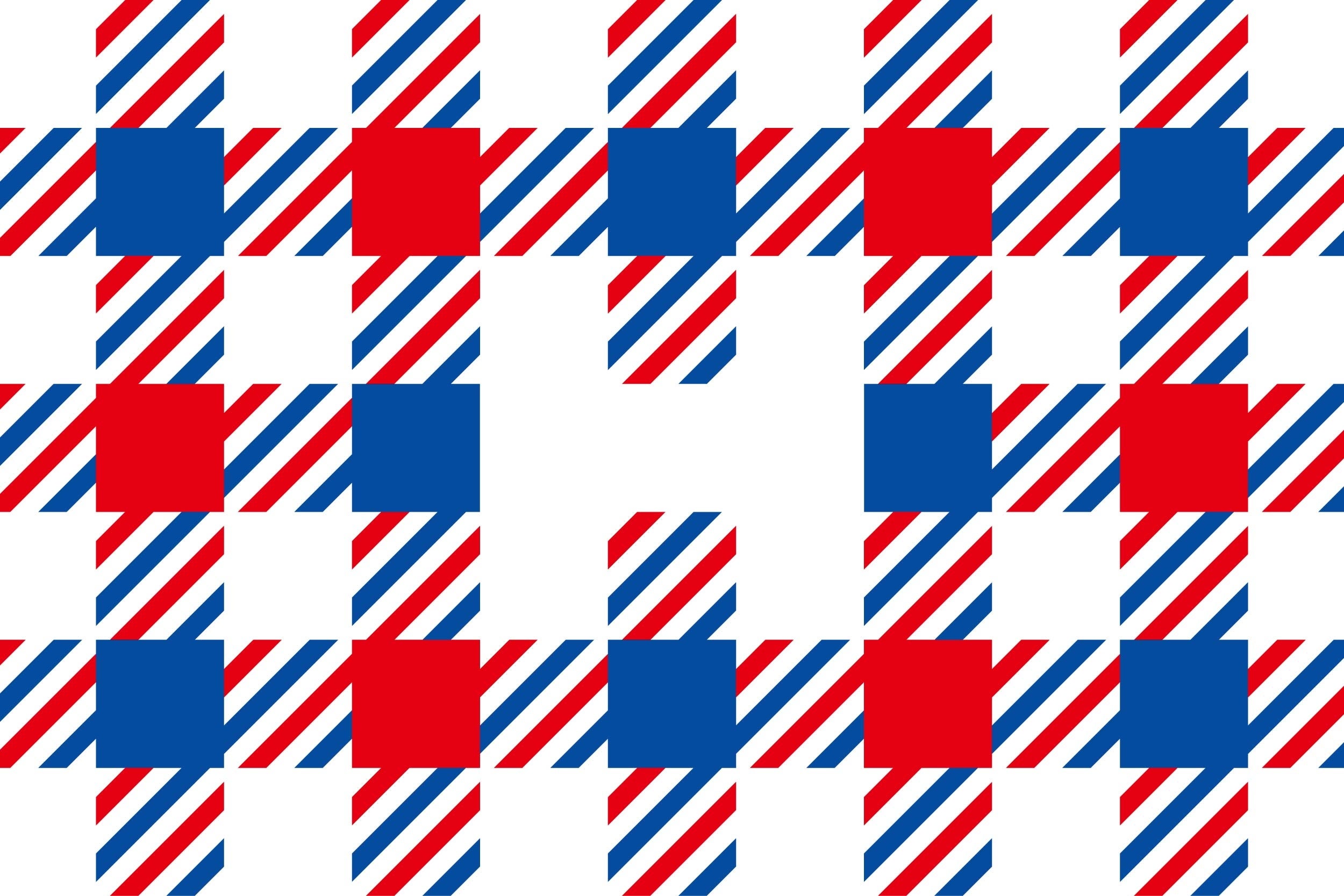 ヒロタのブルーと赤を組み合わせたレトロなチェック柄です。中央にはヒロタの「H」が浮かび上がります。印象的なパターンが店舗やショッパーを彩ります。