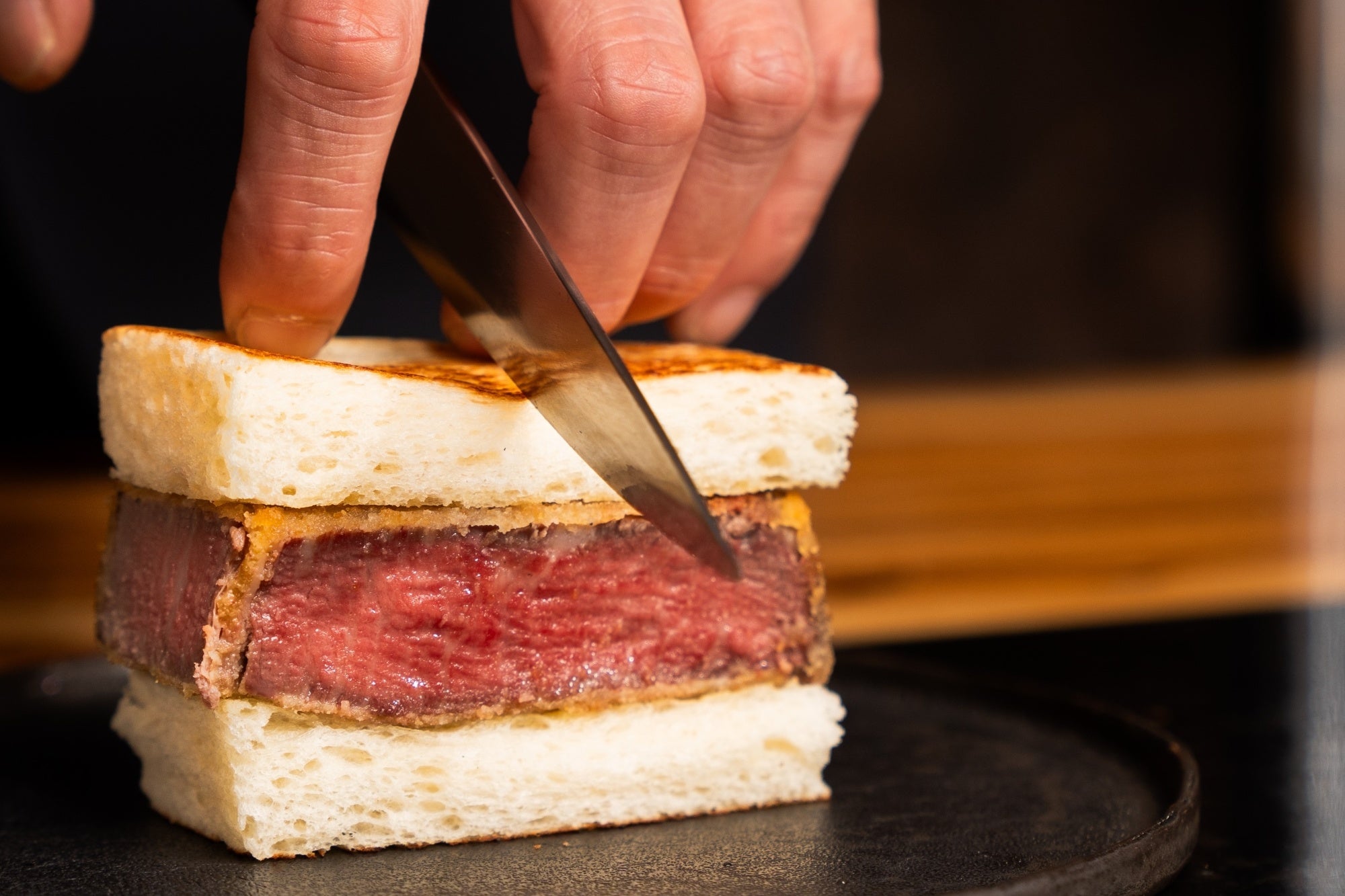 看板メニューの「カツサンド」は希少部位シャトーブリアンを低温調理した後に、薄衣でサッと揚げることで肉の旨味を引き出します。サンドするのは外はカリッ、中はふんわり仕上げた食パン。唇で嚙み切れるほど柔らかい一品になっています。