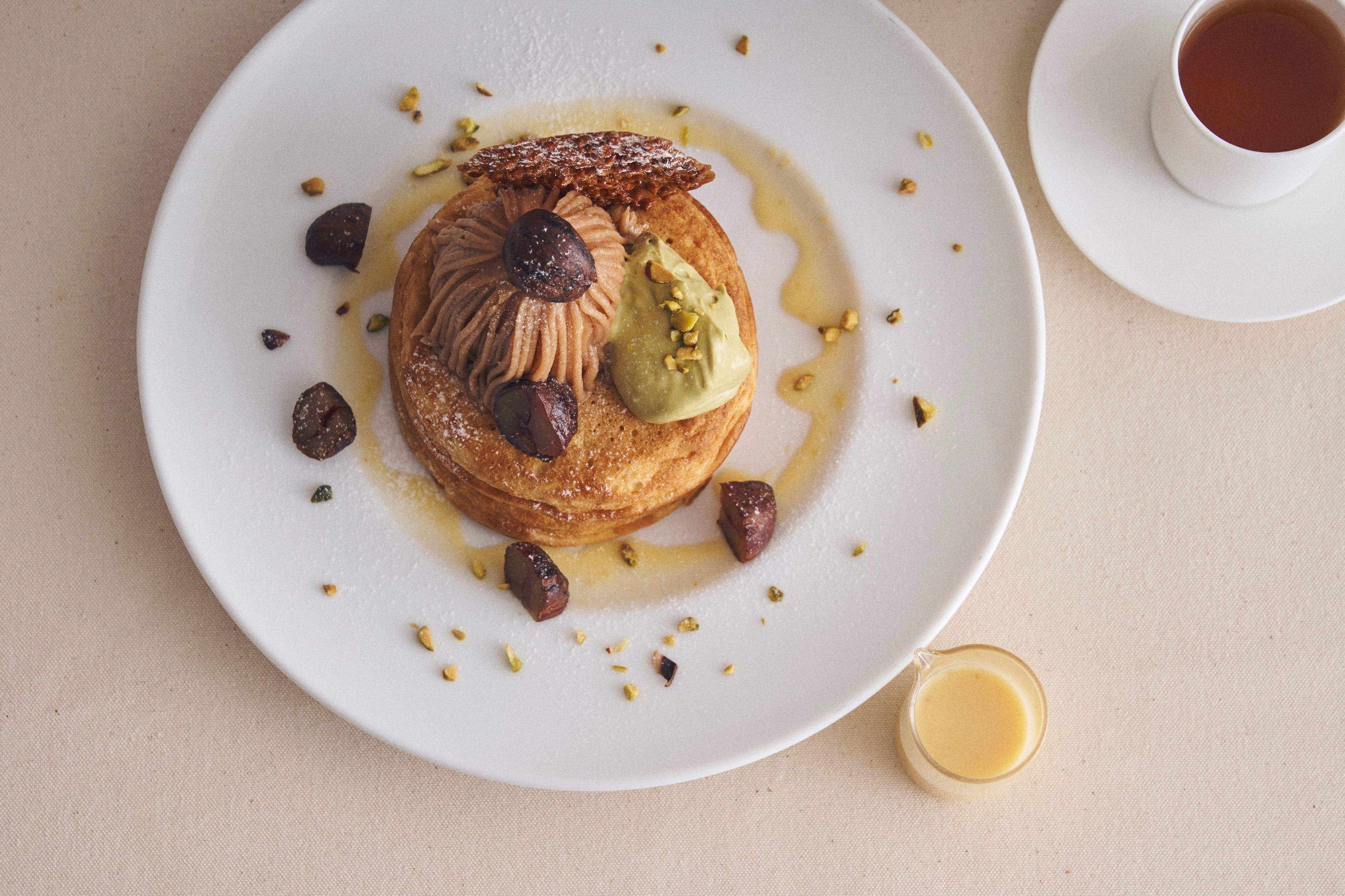 ほっくり甘い〈栗〉と香ばしく濃厚な〈ピスタチオ〉、2つの食材が掛け合わさって生まれた、奥行きのある味わいのパンケーキ。