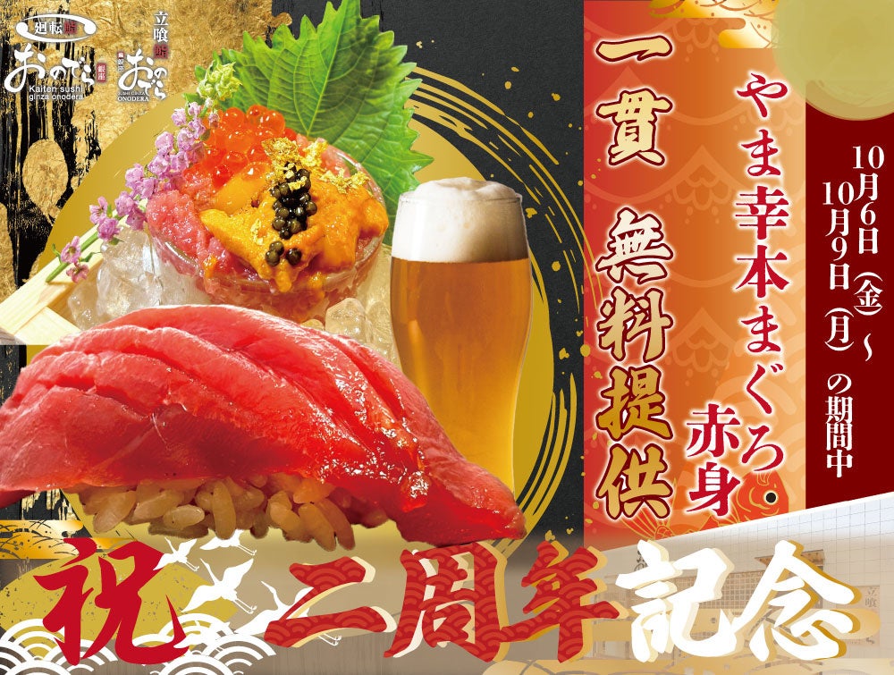 この度2周年を迎え、お客様への深い感謝を込め、ご来店頂いたお客様全員に、「やま幸本マグロ赤身」を1貫、無料提供いたします。また、もはや恒例となった大迫力の「『やま幸』まぐろ解体ショー」をお客様の目の前で展開、「ビール半額&仲卸大特価」「『鮨 銀座おのでら総本店』ランチ招待券などが当たる!ハズレなし福引」をご用意いたします。皆様のお越しを心よりお待ちいたしております。