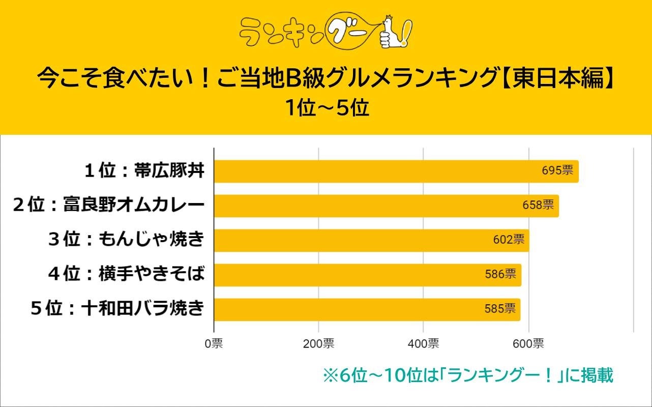 1位「帯広豚丼」に続く2位は「富良野オムカレー」。北海道のご当地B級グルメがTOP2を占める結果となりました。魅力的な食材を豊富に有する北海道ブランドへの信頼がうかがえます。それと同時に、1位から10位すべての順位で100票以上の差は開かなかったことから、最近のご当地B級グルメでは突出して人気のメニューはなく、各地方が切磋琢磨してそれぞれのメニューが持つ魅力を全国へ普及していることが感じられました。同じく発表した西日本のご当地B級グルメランキング(https://rankingoo.net/articles/local/02492a)でも同様に、大きな票の偏りは見られませんでした。