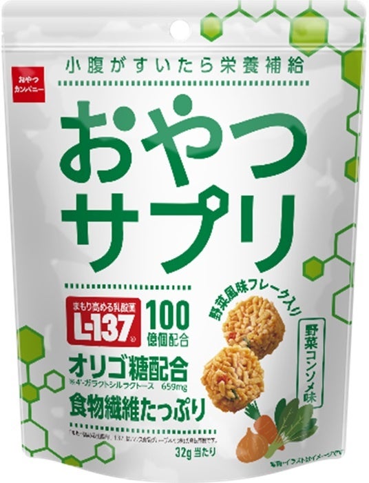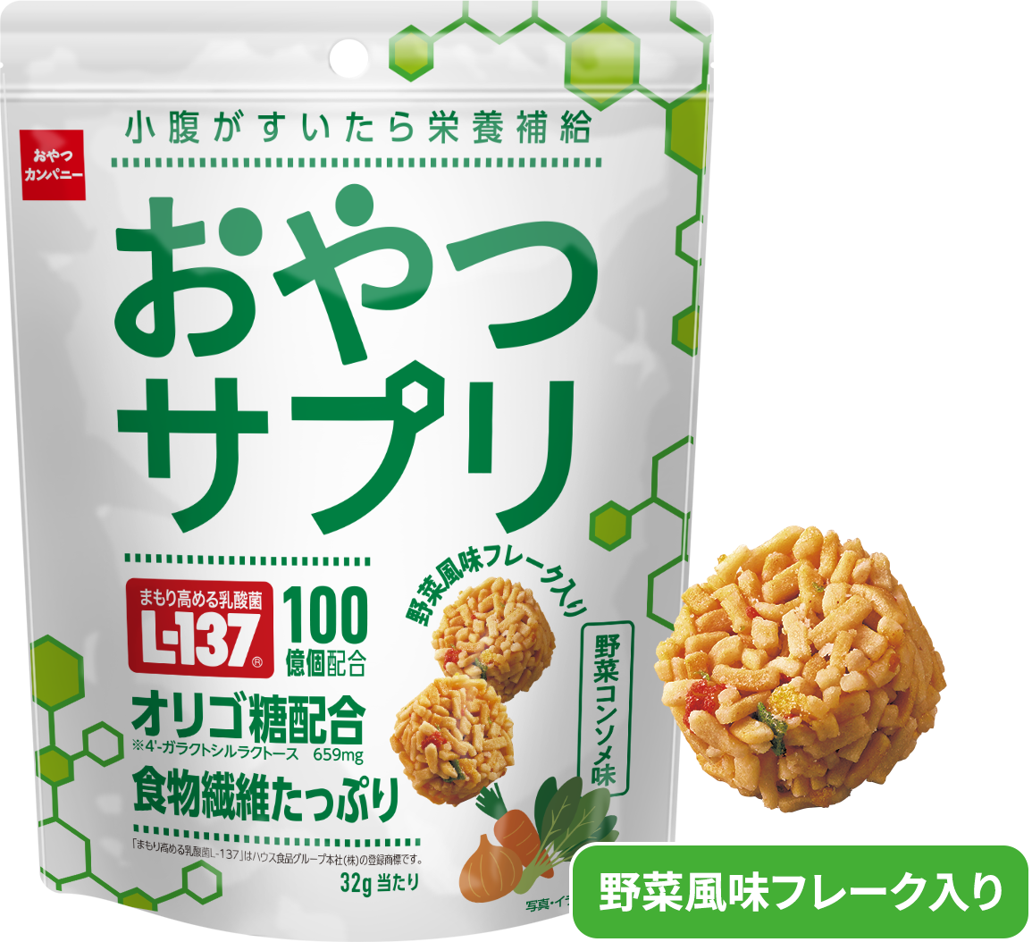 「サンキュ!明るいミライ大賞 for woman」を受賞した「おやつサプリ(野菜コンソメ味)」は、トマト、カボチャ、ほうれん草などの野菜風味フレークを混ぜ込んだザクザク食感のビッツを、優しい味わいの野菜コンソメフレーバーで味付けし、ひとくちサイズに仕上げています。1袋(32g)に『まもり高める乳酸菌L-137®』100億個とオリゴ糖を配合。食物繊維もたっぷり摂れるカラダに嬉しいおやつです。