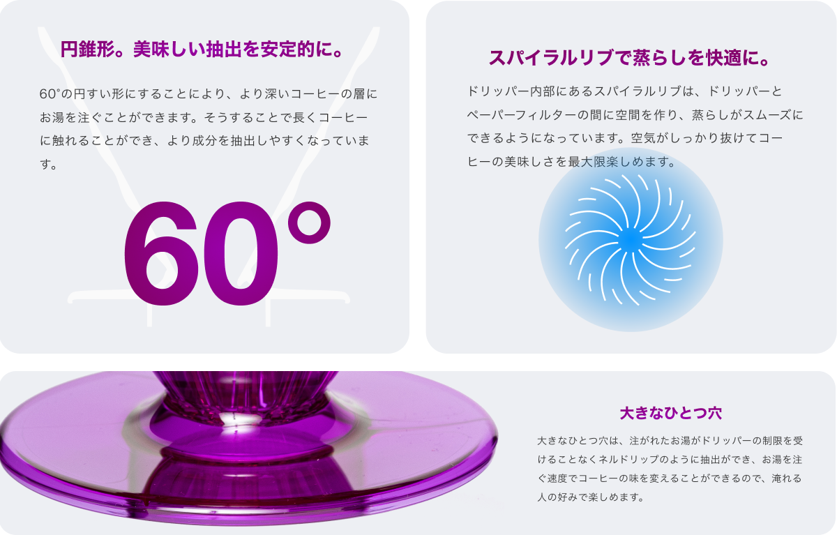 世界的なコーヒー器具メーカーHARIO(ハリオ)が2005年に発売し、一気にコーヒー愛好家に広まったV60ドリッパー。円すい形ドリッパーのVの字、角度60°であることから「V60」という名前がつきました。あっさりした味わいを求める人や苦味が柔らかな方がいいという人にもコーヒーを楽しんでもらえる構造です。素早く注げばすっきりした味、ゆっくり注ぐとコク深い味に。抽出速度で味の変化がつけやすいのもポイントです。大きなひとつ穴は、注がれたお湯がドリッパーの制限を受けることなくネルドリップのように抽出ができ、お湯を注ぐ速度でコーヒーの味を変えることができるので、淹れる人の好みで楽しめます。