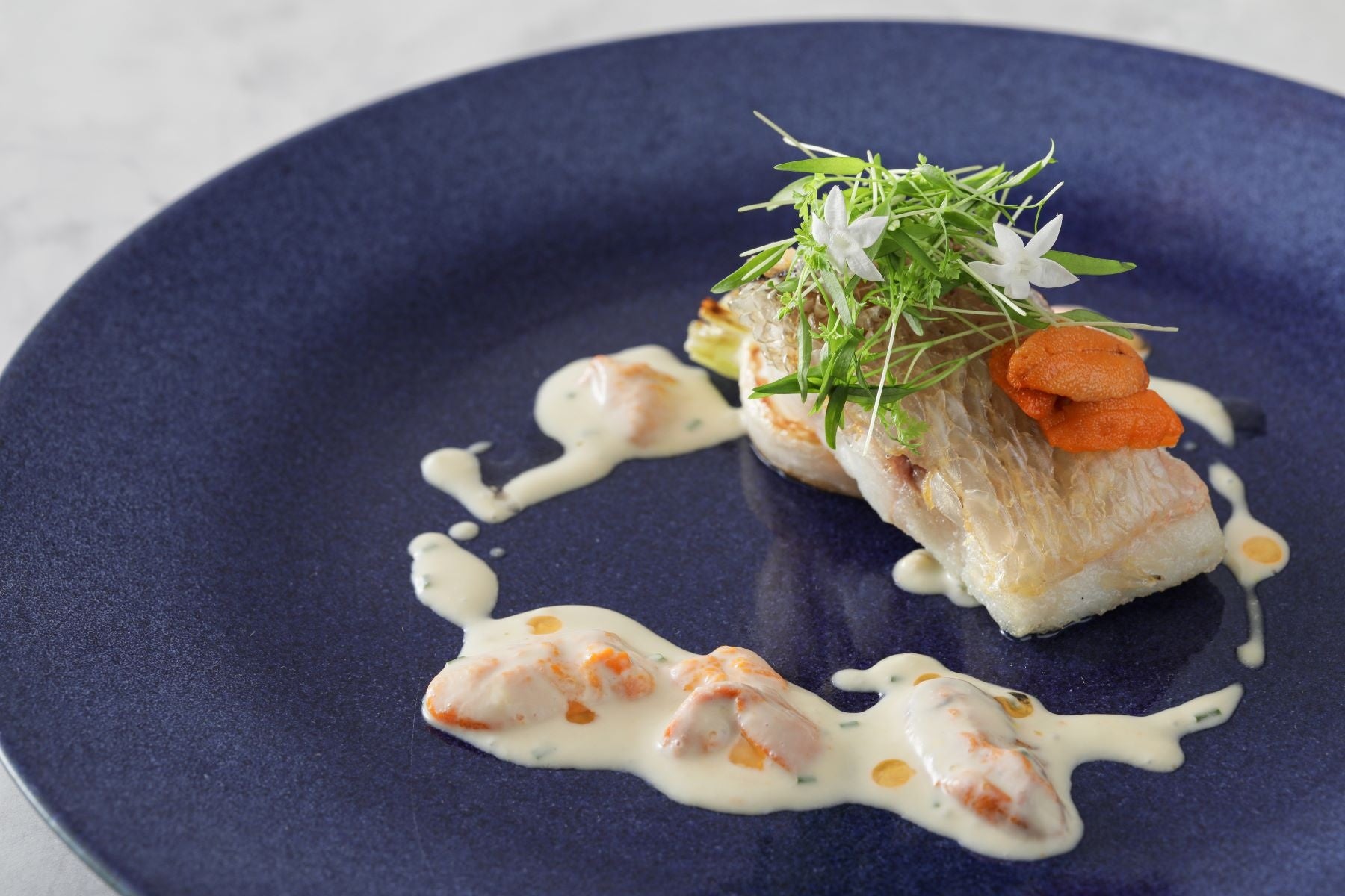 甘鯛の松笠焼きと今市カブのロースト 雲丹のブールブランソース ピカンテオイルのアクセント