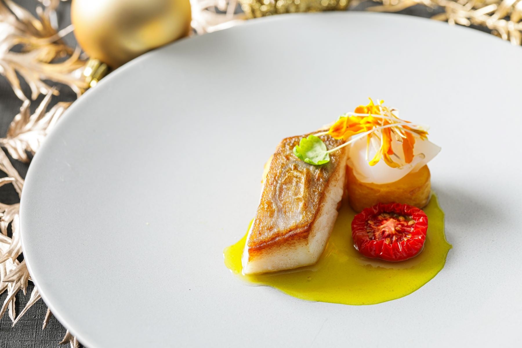甘鯛の松笠焼きと今市カブのロースト 雲丹のブールブランソース ピカンテオイルのアクセント