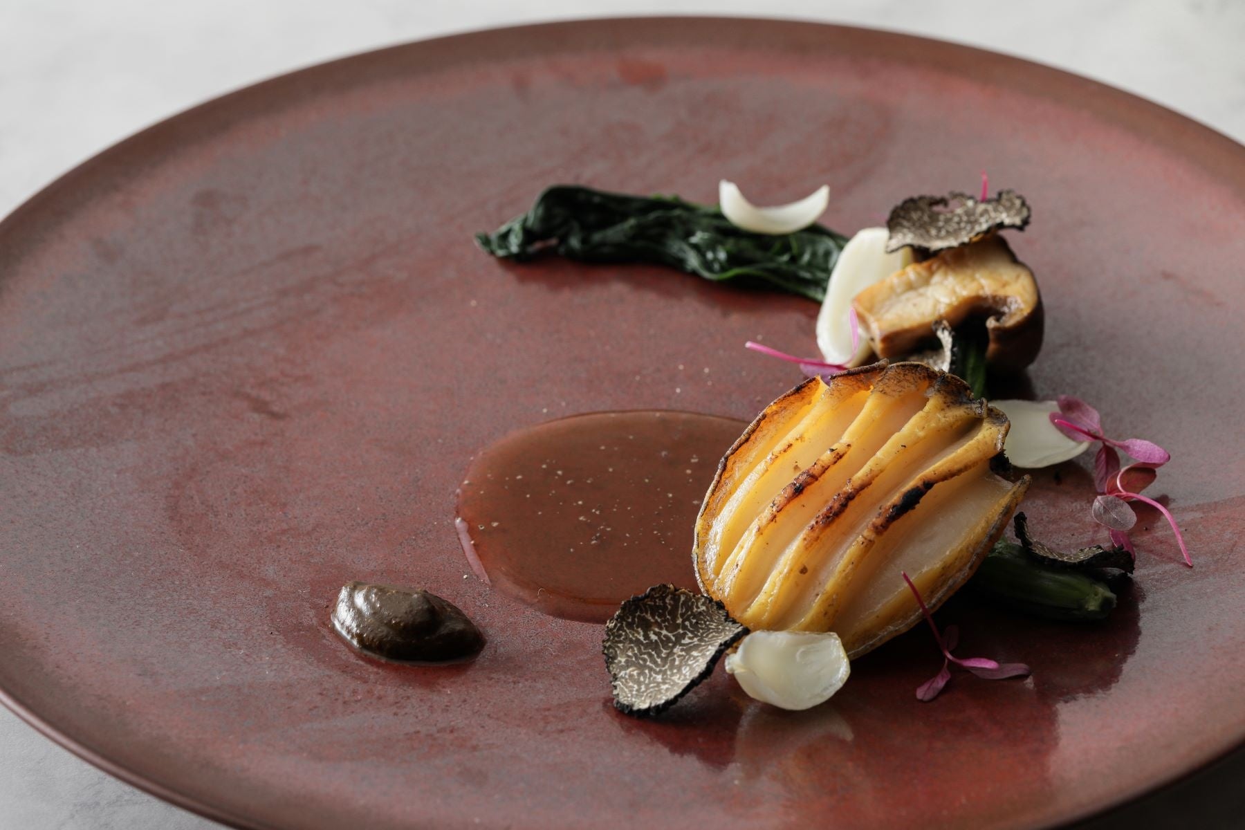 蝦夷鮑と黒トリュフ ゆり根のブレゼ コンソメのソース 肝のピュレを添えて