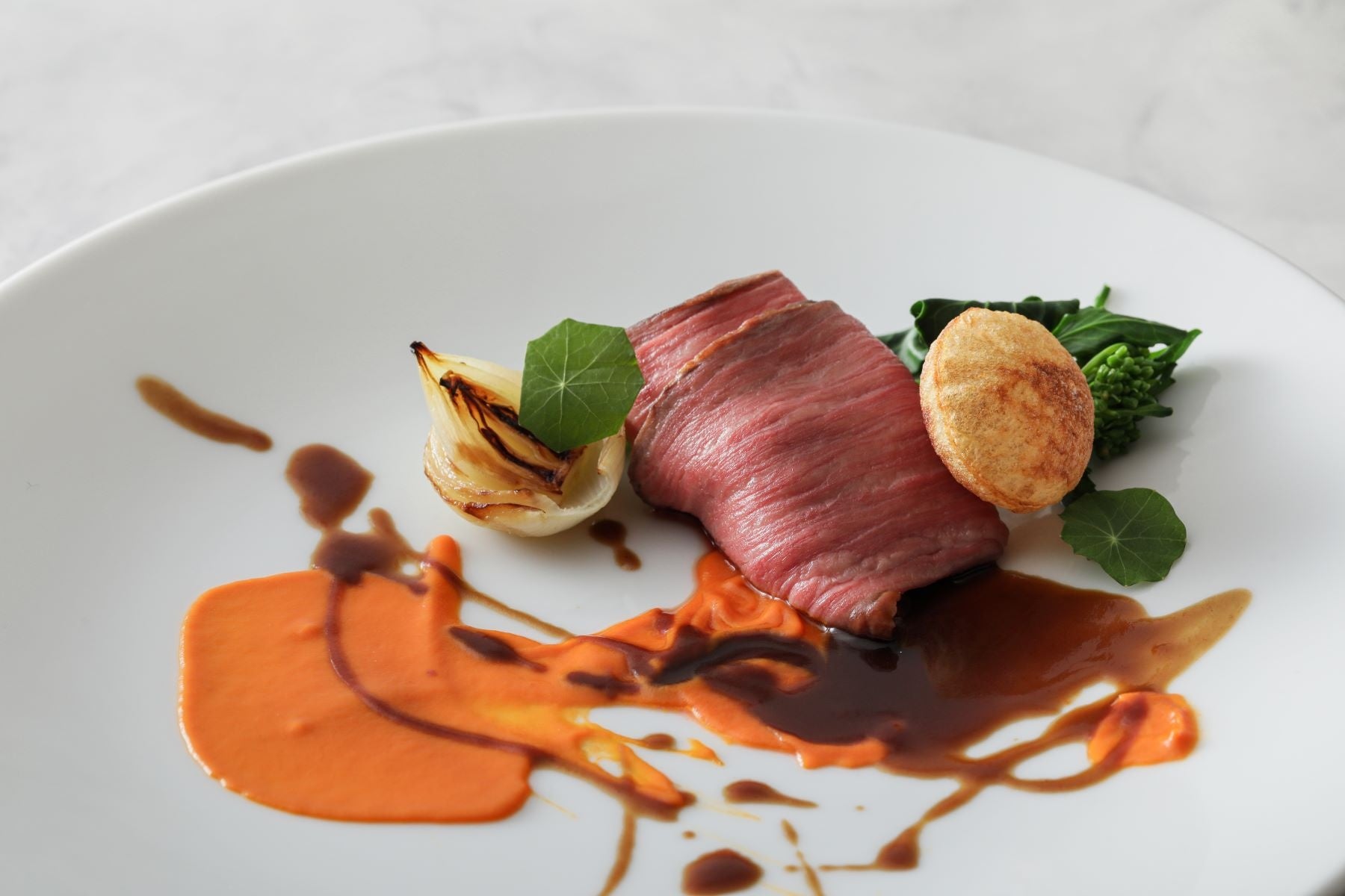 松阪牛のローストビーフ ソース・ボルドレーズ ポムスフレと金時人参ピュレと一緒に