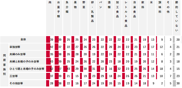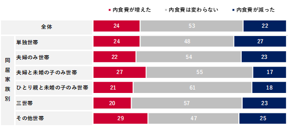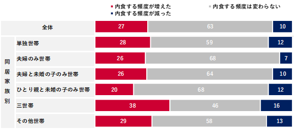 また、内食費の変化については、「変わらない」が53%、頻度は「変わらない」が63%となった。節約意識の高まりが伺える一方で、費用や頻度の減少は見られなかった。頻度を同居家族別で見ると、「三世帯」で「増えた」が38%と高かった。外食の頻度を減らして内食を増やしている様子が伺えた。