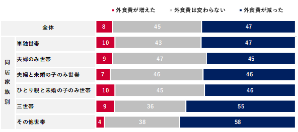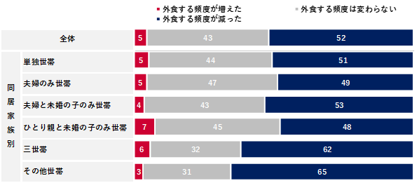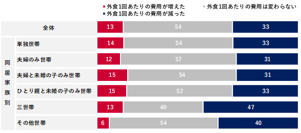 また、同居家族別で見ると、「三世帯」において、外食費・頻度・1回当たりの費用のそれぞれで「減った」の割合が他の世帯よりも多くなっており、外食を節約している傾向が見られた。