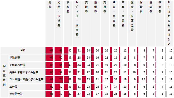 また、節約を意識している項目は「食費」が64%で最も高く、次いで「光熱・水道費(61%)」が続く。